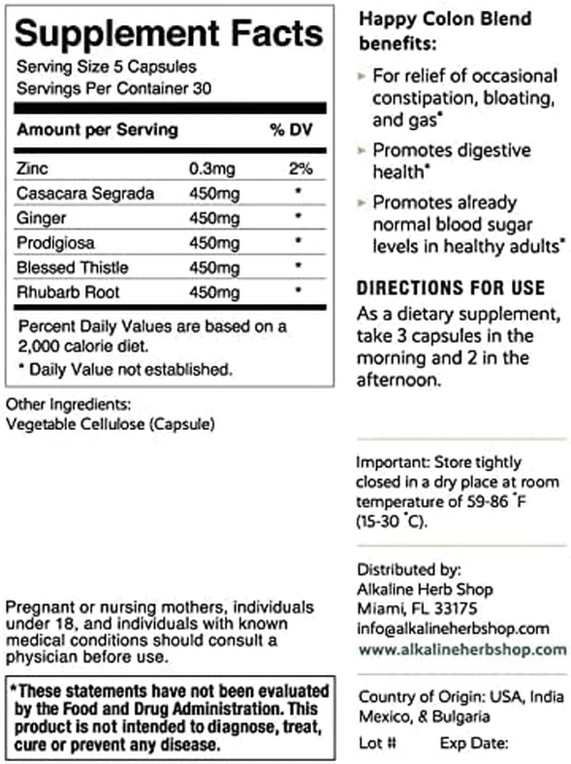 - MADE FOR YOU: Alkaline Herb Shop herbal remedies fit perfectly into anyone's life. Formulated for naturally optimizing the wellness of healthy adults, our nourishing dietary supplements are always vegan and gluten-free. Each bag of our natural Happy Colon Supplement contains 150 vegetable cellulose capsules.