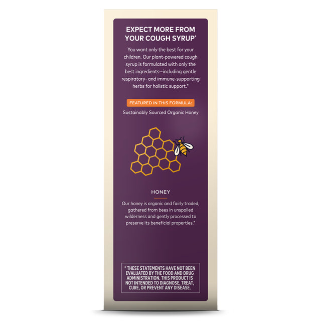 Made With Elderberry, Honey, Ivy Leaf USDA Organic Non GMO Project Verified Herbal Supplement No Artificial Sweeteners No Added Flavors Certified Organic by Oregon Tilth Honey is traditionally used to soothe an occasional dry cough. Expect More From Your Cough Syrup You want only the best for your children. Our plant-powered cough syrup is formulated with only the best ingredients-including gentle respiratory- and immune-supporting herbs for holistic support. Featured in this Formula: Sustainably Sourced Organic Honey Honey Our honey is organic and fairly traded, gathered from bees in unspoiled wilderness and gently processed to preserve its beneficial properties. Connecting People, Plants & Planet Purity - All products are screened for pesticides, microbes & heavy metals. Potency - Concentrated extracts provide a delicious & convenient way to get your daily dose of herbs. Integrity - See the proof at meetyourherbs.com, the world's first herb traceability platform.