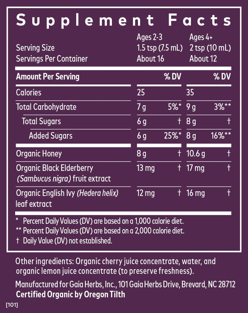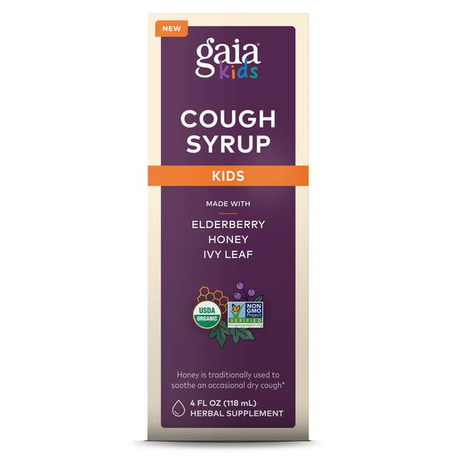 - Gaia Herbs GaiaKids Cough Syrup, Respiratory and Immune Support Cough Medicine for Kids, with Organic Honey, Black Elderberry, and Ivy Leaf, Black Elderberry Cough Syrup, 4 Fl Oz