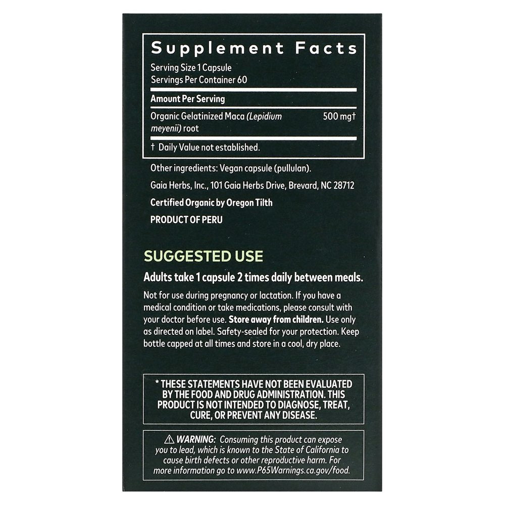 | Product Name | Gaia Herbs, Gelatinized Peruvian Maca Root, 60 Vegan Capsules |