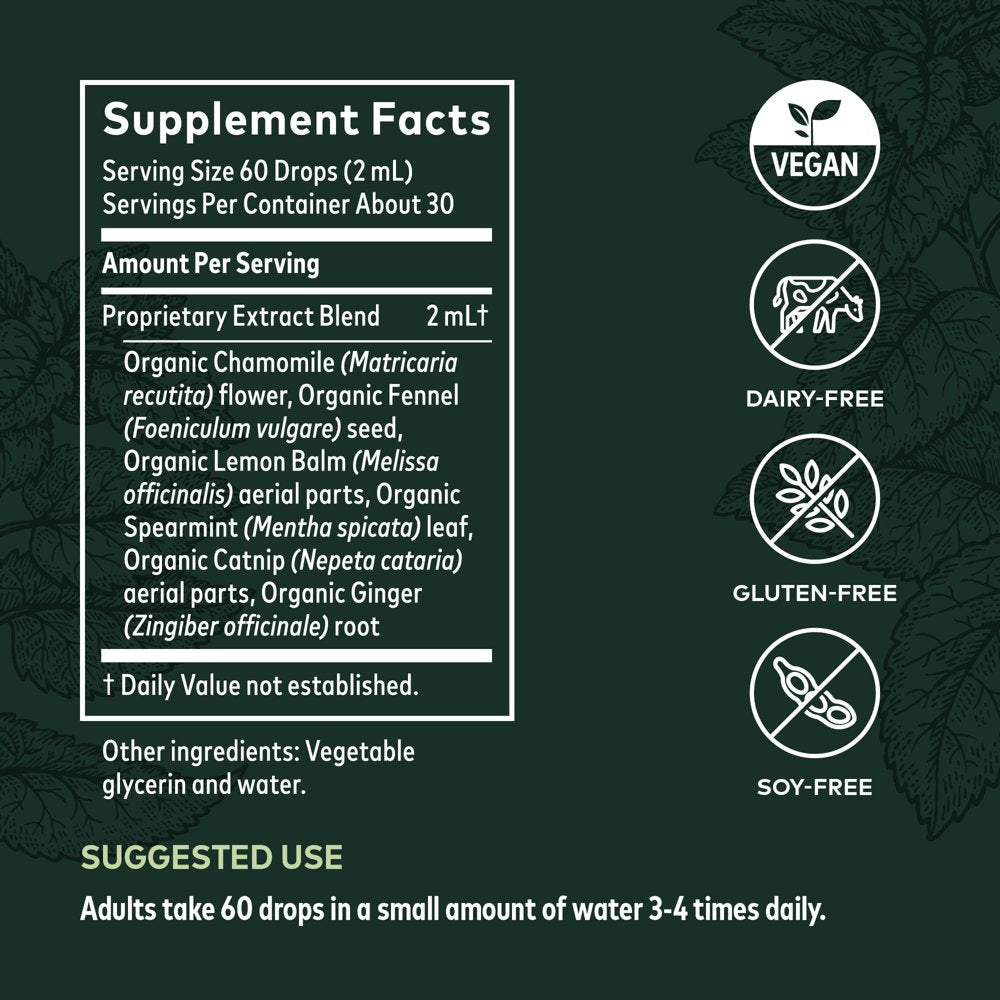 - Premium Organic Ingredients: This liquid dietary supplement contains catnip, chamomile, fennel, spearmint, ginger root, and lemon balm. These vitamins for men and women are an effective gas treatment.