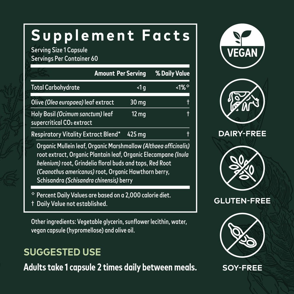 Respiratory Support Herbal Supplement Est. 1987 - Integrity - Purity - Potency Certified B Corporation Vegan Gluten-Free Soy-Free Connection Plants & People Since 1987 Traditional herbs to support overall lung & respiratory health. Made with Mullein, Plantain & Gaia-Grown® Marshmallow root. Purity - Keep it Clean All products are screened for pesticides, microbes & heavy metals. Integrity - Keep it Real The world's first herb traceability platform. Potency - Keep it Strong Concentrated plant extracts are delivered in our patented Phyto-Caps® technology.