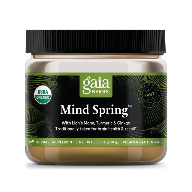 - Gaia Herbs Mind Spring, Herbal Mushroom Supplement Powder to Help Maintain Brain Health and Recall, with Lion’s Mane, Turmeric, and Ginkgo, USDA Certified Organic, 3.53 Oz (Up to 45-Day Supply)