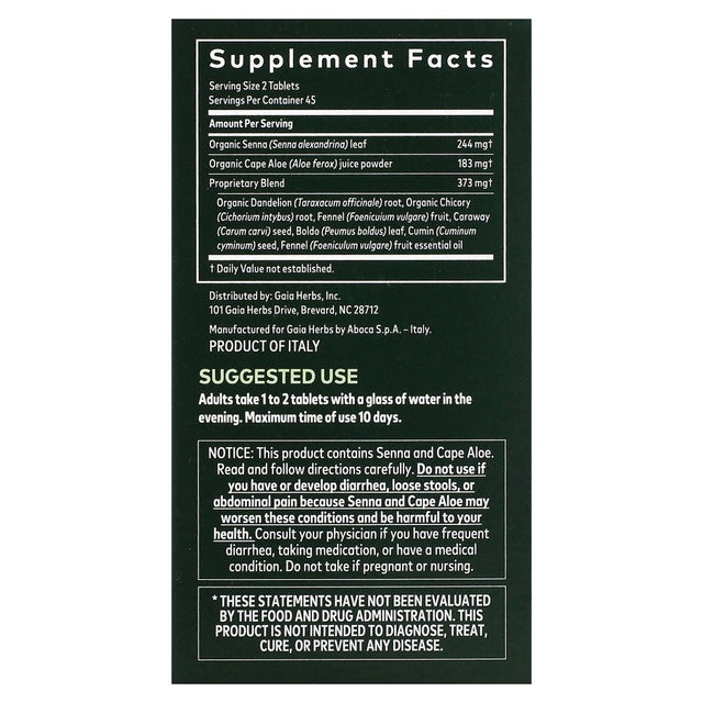 Notice: This product contains Senna and Cape Aloe. Read and follow directions carefully. Do not use if you have or develop diarrhea, loose stools, or abdominal pain because Senna and Cape Aloe may worsen these conditions and be harmful to your health. Consult your physician if you have frequent diarrhea, taking medication, or have a medical condition. Do not take if pregnant or nursing.