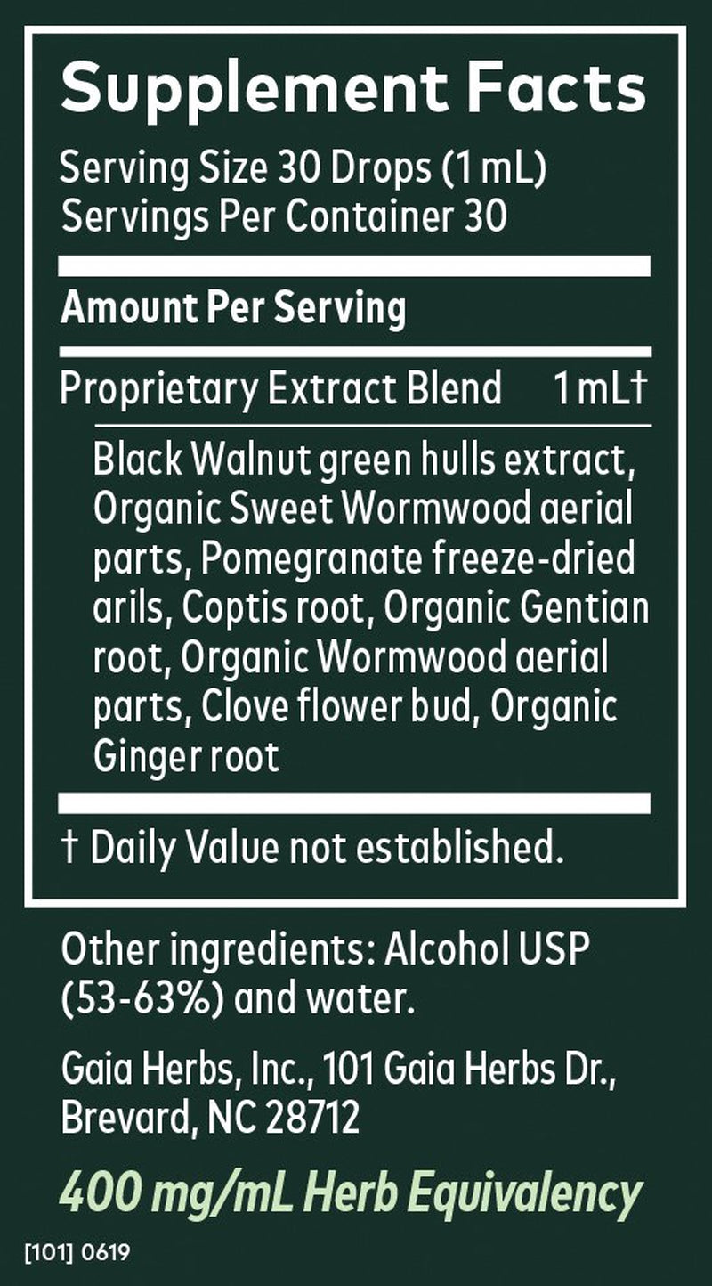 Proprietary Extract Blend: Black Walnut green hulls extract, Organic Sweet Wormwood aerial parts, Pomegranate freeze-dried arils, Coptis root, Organic Gentian root, Organic Wormwood aerial parts, Clover flower bud, Organic Ginger root. Other ingredients: Alcohol USP (53-63%) and water./div>