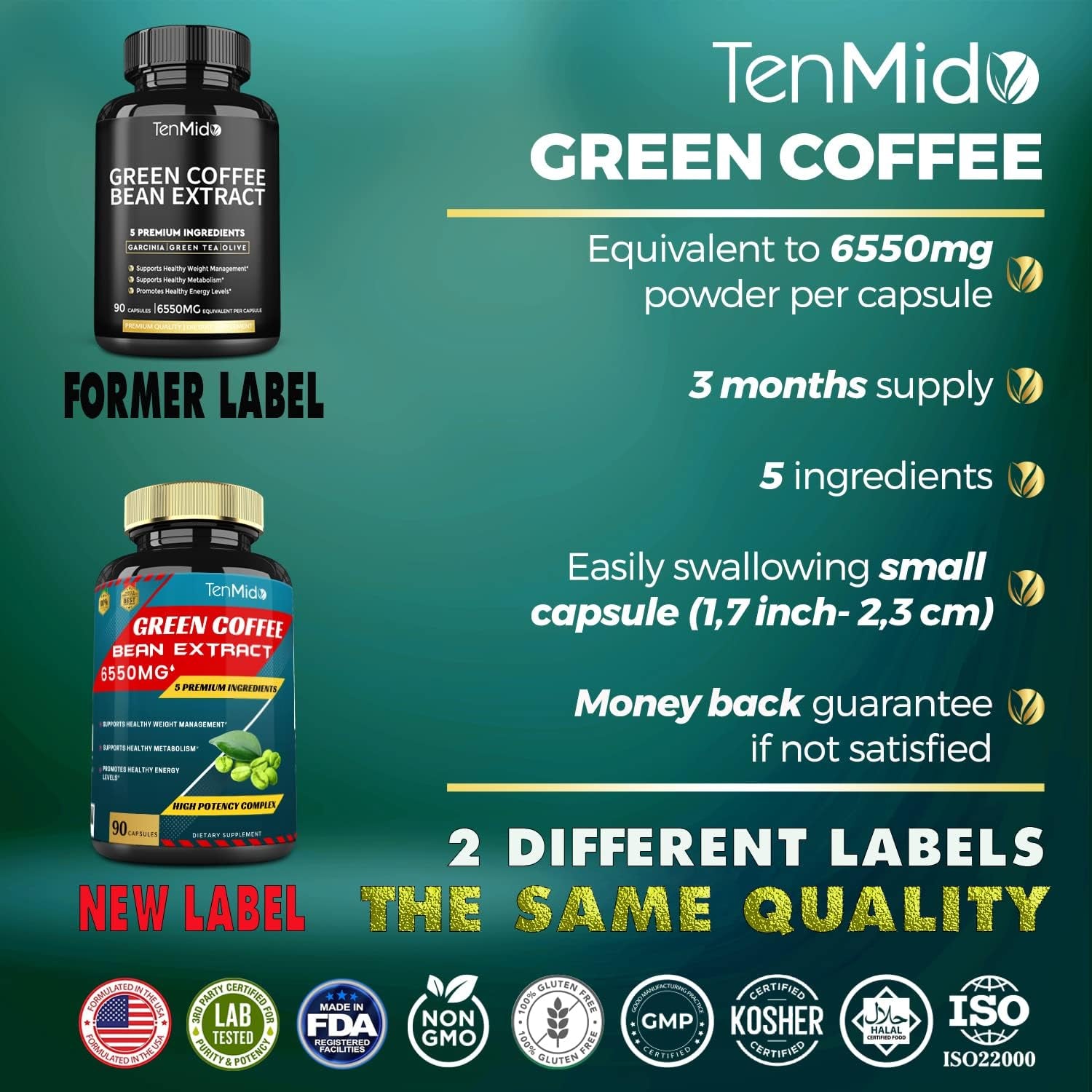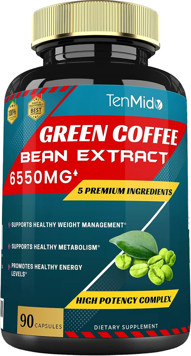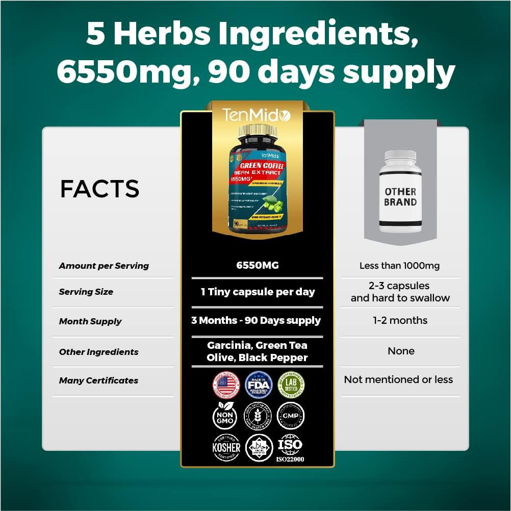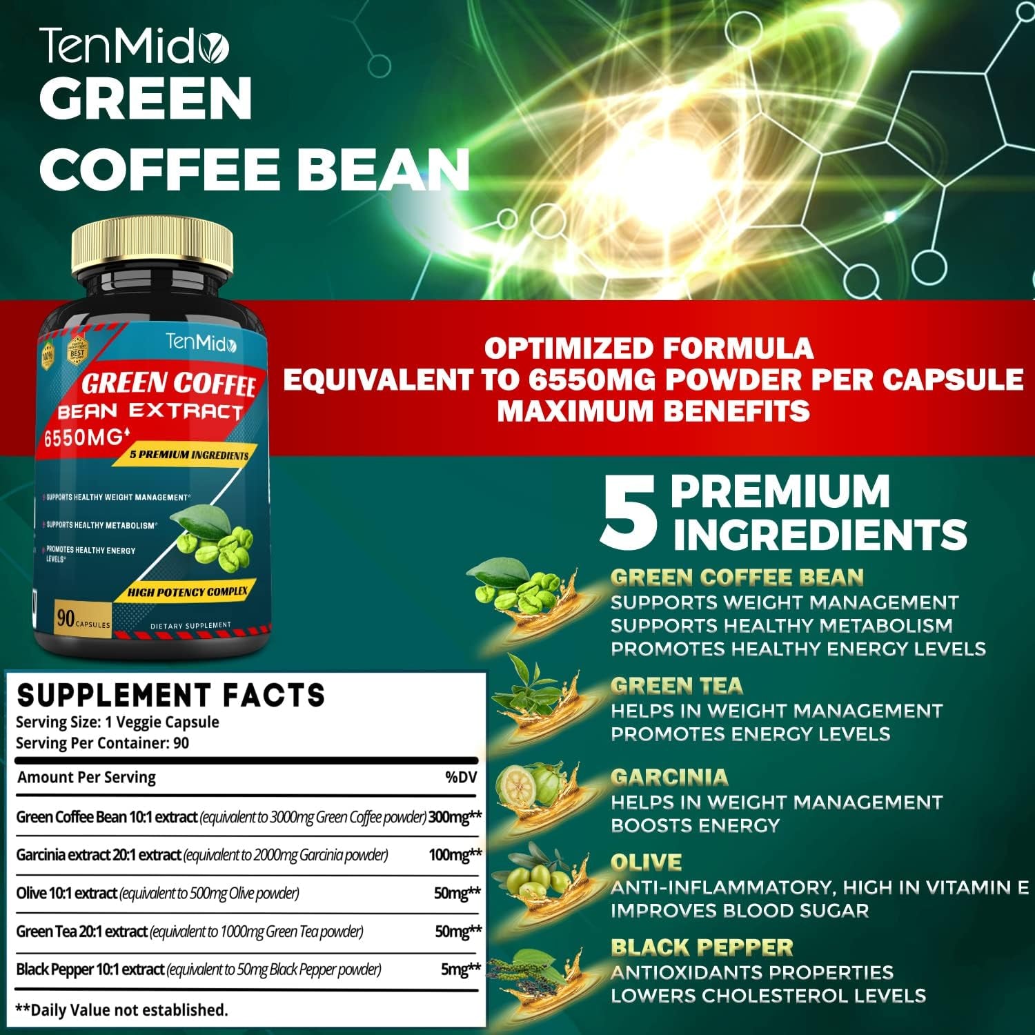 • ❤️ High Potency Complex: Tenmido Green Coffee Bean Extract Capsules combination equivalent to 6550mg of the highest quality Green Coffee Bean powder with 5 extra powerful herbal problematic ingredients: Garcinia, Olive, Green Tea, White Kidney Bean, Black Pepper. With the special optimized formula, our product has been shown to be one of the most advantageous herbs, highest absorption and bioavailability for your overall health.