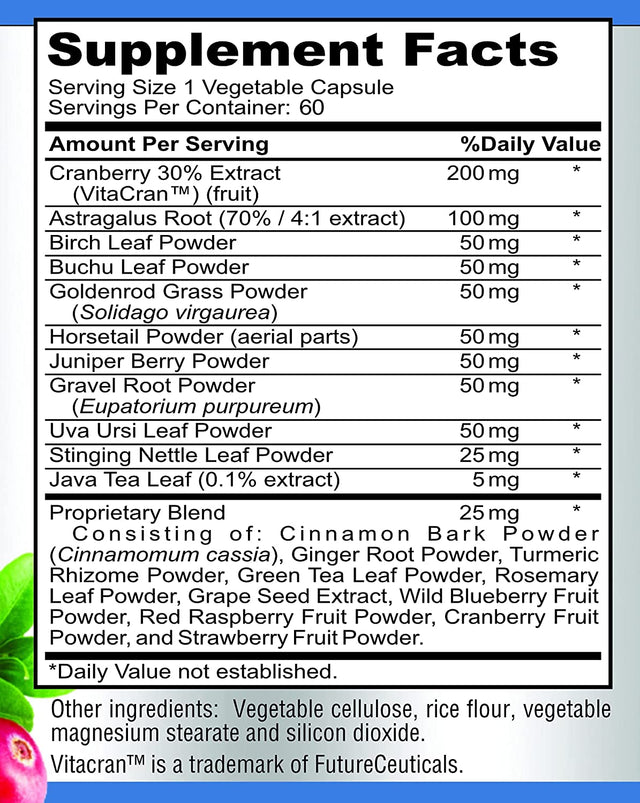 Just take one Kidney Cleanse capsule a day to get a powerful all-natural fusion of Vitacran Cranberry Extract, Astragalus, Birch Leaf Powder, Gravel Root Powder, Goldenrod Herb Powder, Uva Ursi Leaf, Java Tea and several other fruits and herbs known to have beneficial cleansing and detox effects.