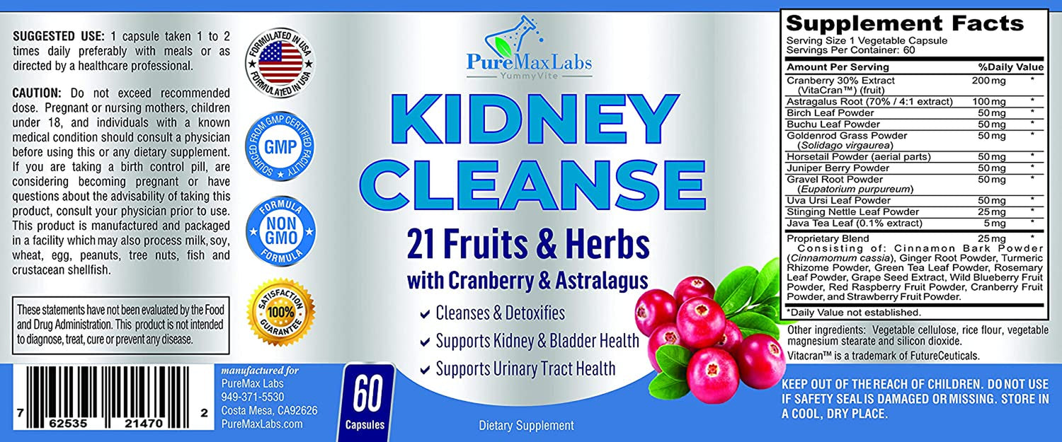 PureMax Labs Kidney Cleanse is a natural herbal kidney support formula made with 21 powerful herbs and fruits including VitaCran Cranberry Extract. Our Kidney Cleanse Capsules help you detox and cleanse gently and naturally.