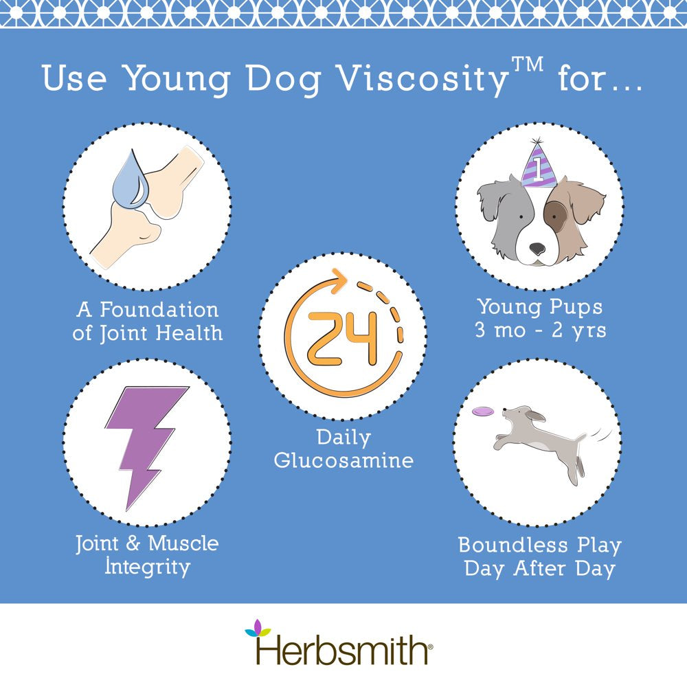 - PERFECT FOR PUPPIES TO 2 YEARS - Many holistic veterinarians recommend giving puppies supplemental glucosamine from the time they are eating food, as a proactive measure for long-term joint health. The ingredients in Young Dog Viscosity reinforce all aspects of the joint, providing long-lasting, continuous support for puppies and young dogs that just go and go!