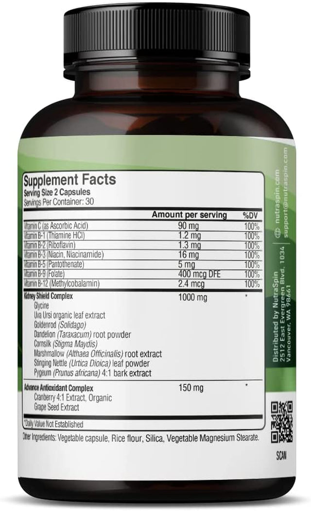 Kidney Health is Universal Problem: Urinary system health is a major concern as 1 out of 3 people in the USA are at risk. NutraSpin Solution: Kidney Shield provides a complex approach for variety of urinary system problems. Scientifically proven botanicals are combined with essential vitamins, and powerful antioxidants support healthy function of your kidneys & bladder Powered by Nature: Kidney Shield contains 17 ingredients including: Uva Ursi organic leaf extract, Goldenrod, Dandelion root powder, Cornsilk, Glycine, Marshmallow root extract, Stinging Nettle leaf powder, Pygeum bark extract, Organic Cranberry extract, Grape Seed extract, Ascorbic Acid (Vitamin C), Thiamine (Vitamin B-1), Riboflavin (Vitamin B-2), Niacin (Vitamin B-3), Pantothenate (Vitamin B-5), Folate (Vitamin B-9), and Methylcobalamin (Vitamin B-12). Fast Results: Rome wasn't built in a day, neither your kidney will be restored to full health overnight. Meticulously developed by one of the leading formulators in the country, this cutting-edge kidney supplement produces first results in as little as 2 weeks. For best results we recommend continuous use for over 60 days. Leave urinary health problems behind and live your best life. Add NutraSpin Kidney Shield to your cart today!