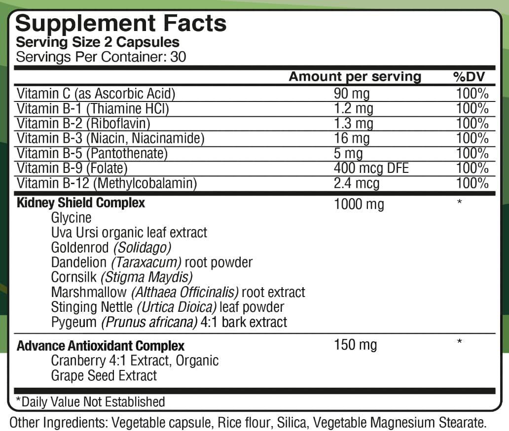 - YOUR HEALTH COMES FIRST: Provide your body with essential nutrients for kidney health by adding 2 easy-to-swallow vegan Kidney Shield capsules to your diet. Forget about tiredness, trouble sleeping, swollen ankles, and urinary problems. Get back to living action-packed life!
