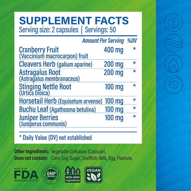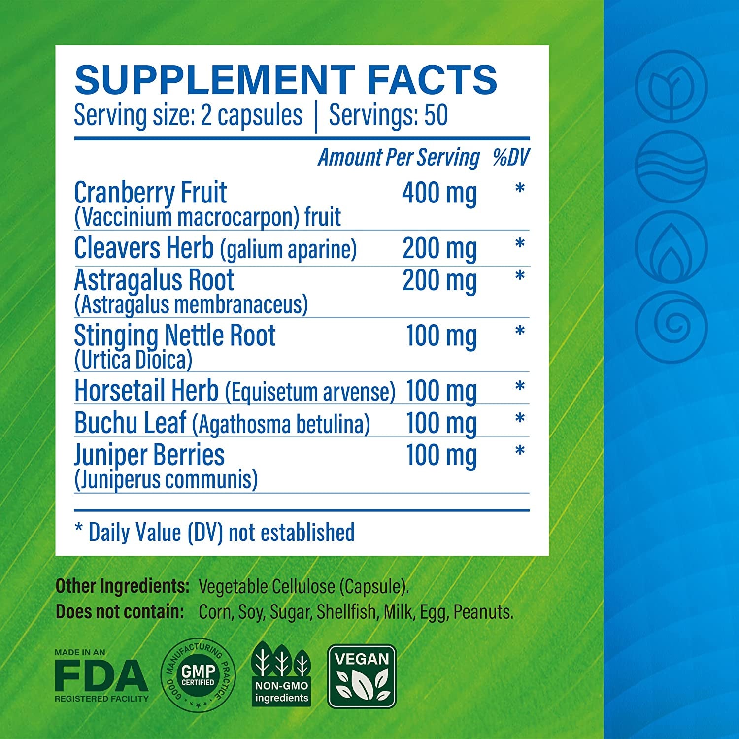 Each serving (2 capsules) of our dietary supplement provides your body with 600mg of its herbal blend. It consists of organic cleaver's herb, cranberry, horsetail, stinging nettle, buchu, astragalus, and juniper - all of which contain natural compounds that may help support normal kidney function.