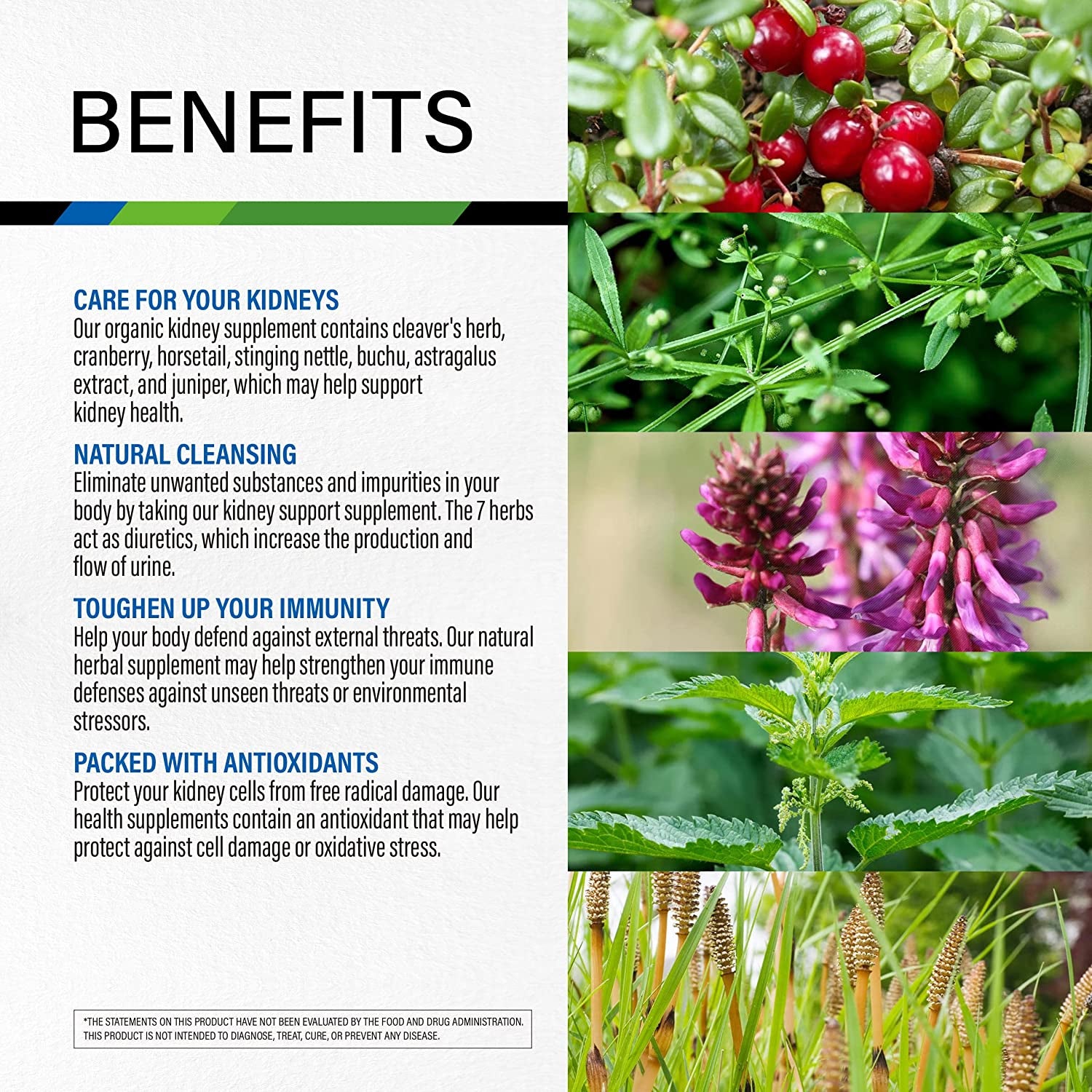 - Natural Cleansing - Eliminate unwanted substances and impurities in your body by taking our kidney support supplement. The 7 herbs act as diuretics, which increase the production and flow of urine.