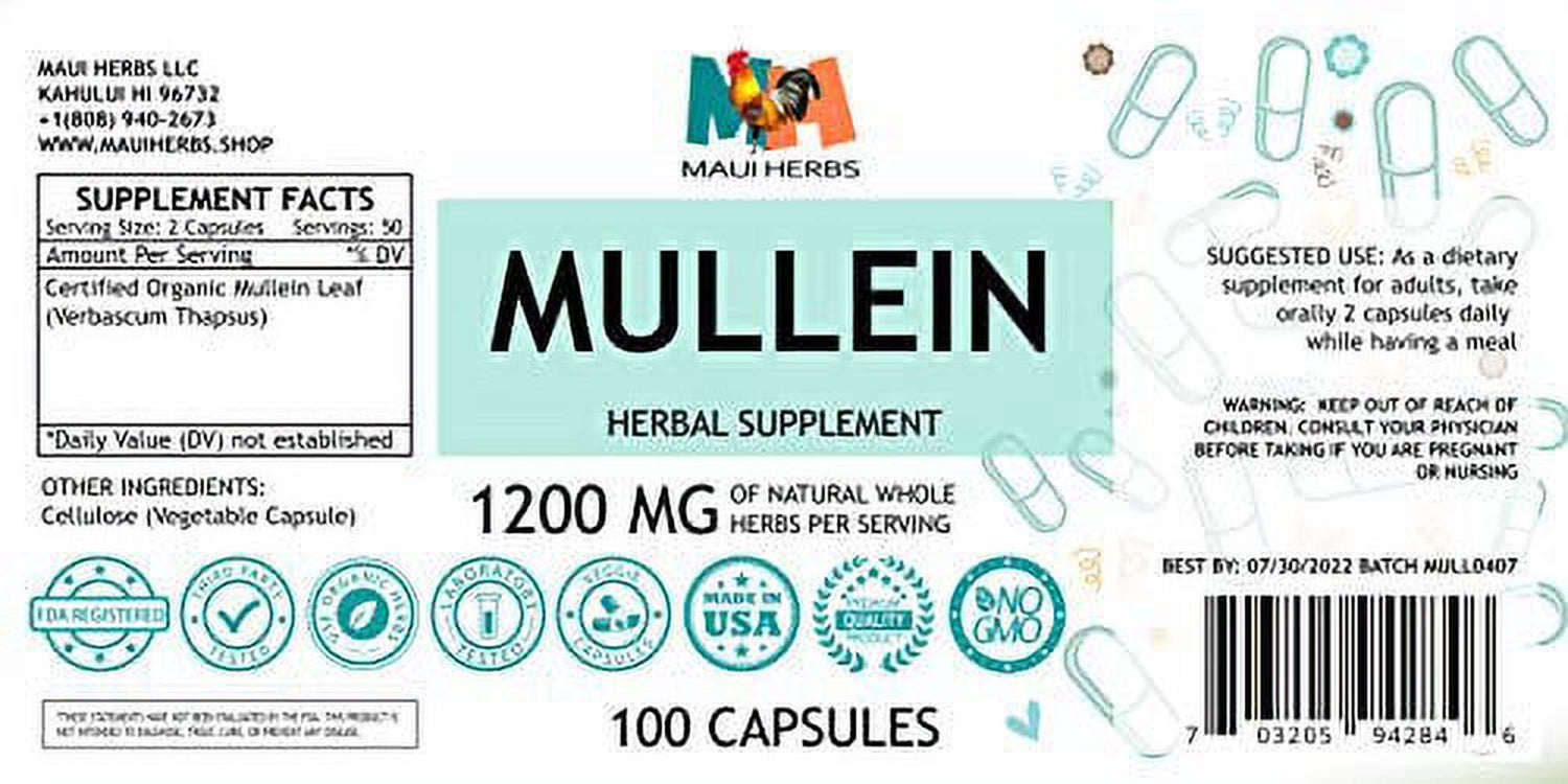 | Product Name | MAUWE HERBS Mullein Leaf Capsules - Lung Cleanse - Organic Mullein Leaf Extract Pills - Lung Detox - Respiratory Health - Organic Lung Health Herbal Supplement - 1200mg - 100 Vegan Capsules 100 Count (Pack of 1) |