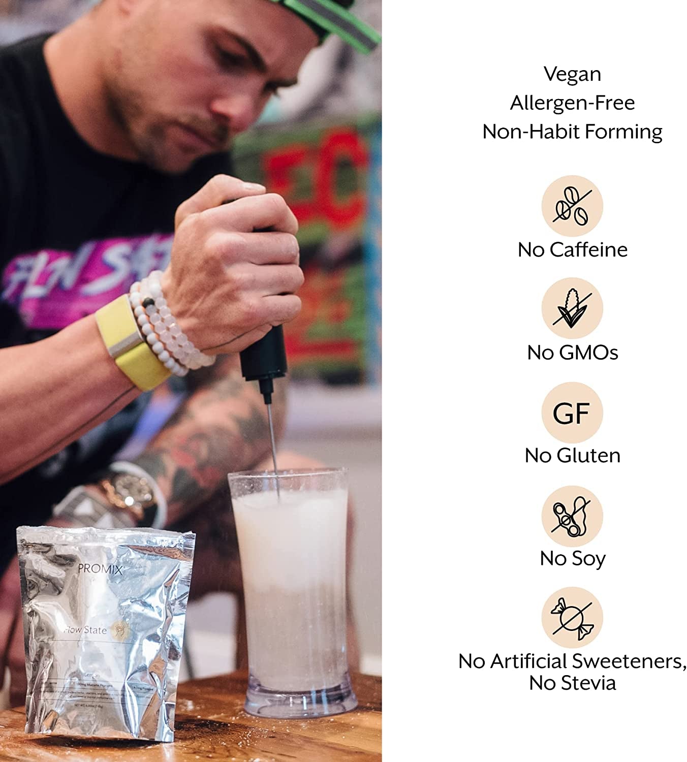 - Seriously Clean: Flow State is vegan, allergen-free, and non-habit forming. All Promix products are free of GMOs, gluten, soy, artificial sweeteners, fillers, and stevia. 94% of ingredients sourced from North America. Partner of 1% for the Planet. Produced in facilities using GMP (Good Manufacturing Practice) standards.