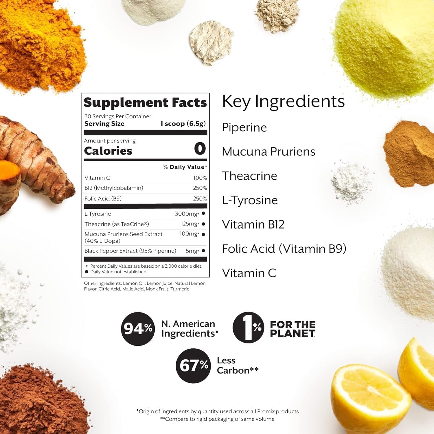 - Key Ingredients: Contains Piperdine, Mucuna Pruriens, Theacrine, L-Tyrosine, Vitamin B12, Folic Acid (Vitamin B9), and Vitamin C.