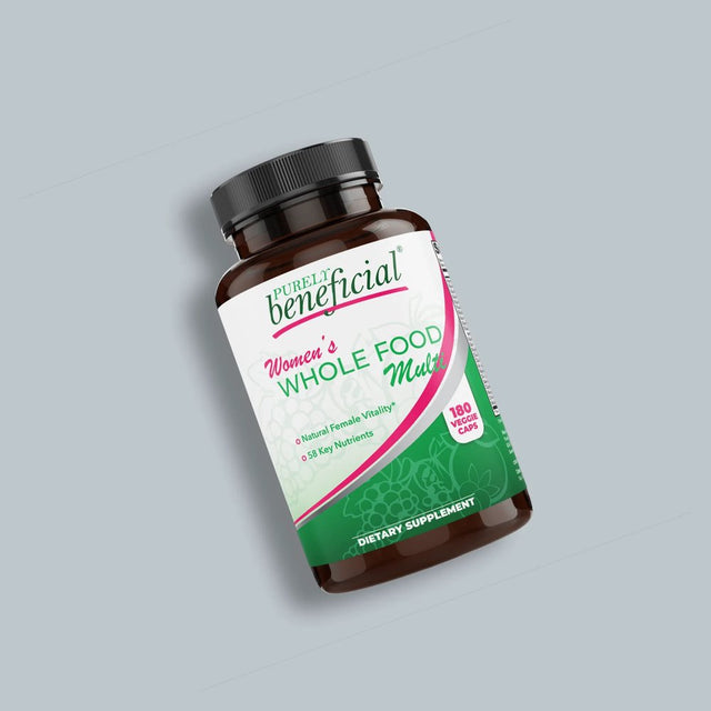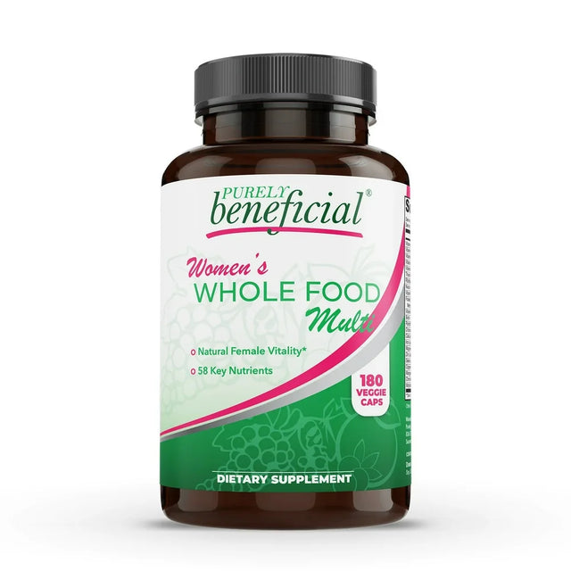 Purely Beneficial Women’s Whole Food Multi-Vitamin Featuring 58 key elements for Women's vitality. Female Wellness Complex, Joint / osteo Complex, Extensive Fruit Vegetable Complex, Hair Skin Nails Complex, Female Probiotic Complex. 60 Day Supply Premium Plant-Based Ingredient Our Whole Food Multivitamins are made with plant-based vitamins and minerals many of which are superior trademarked ingredients backed by extensive scientific studies. Crafted and balanced for optimal nutritional value, and female wellness Superior bioavailability Quatrefolic® Methyl Folate, B12 Methyl cobalamin, Aquamin® Magnesium, Aquamin® Calcium, and chelated minerals like Selenium, Albion® Copper, Contact us for a no-hassle return at any time if you are not pleased As strong and independent women we must ensure that our bodies get the right nutrition. With our busy schedules and demanding lives, we know it can be tough getting the proper amount of fruits, veggies and leafy greens into our meals. Purely Beneficial’s - Women’s Whole Food Multi Vitamin is specifically designed to meet the unique needs of active women throughout her years, providing the nourishment our bodies crave to maintain optimal health and well-being. Using the cleanest most bioavailable ingredients to empower us, achieving our goals.