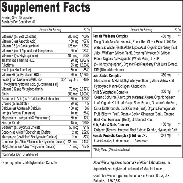 • 100% Pure & Natural Ingredients - Featuring 58 key elements for Womens vitality. Female Wellness Complex, Joint/Osteo Complex, Extensive Fruit Vegetable Complex, Hair Skin Nails Complex, Female Probiotic Complex. 60 Day Supply