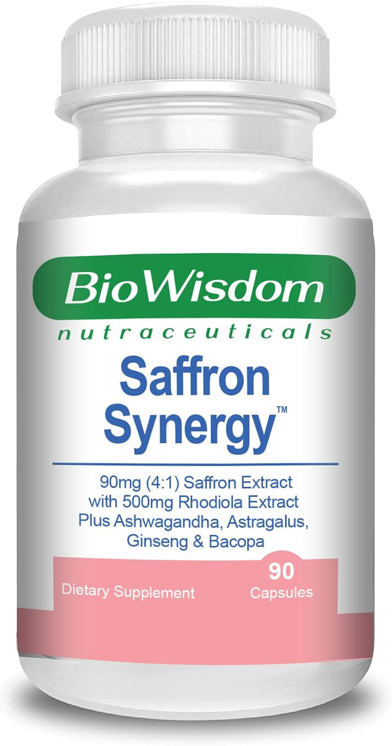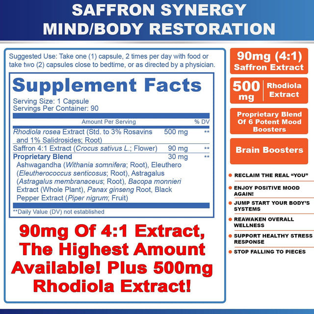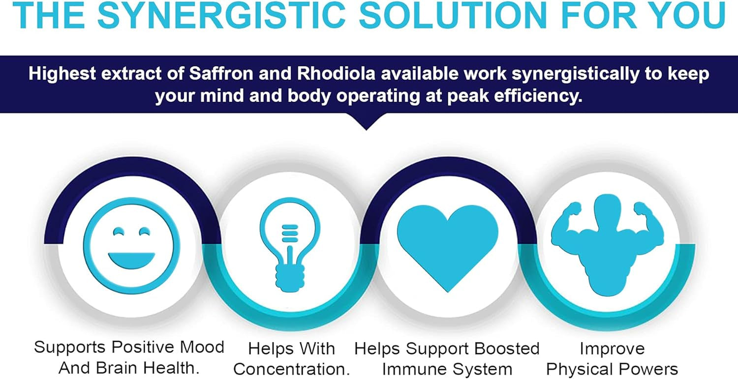 Saffron Synergy Extract 90Mg Rhodiola Extract 500Mg Best Saffron Supplement, Best Saffron Extract 4:1, Saffron Capsules, Saffron Pills, Complete Mind-Body Support with Rhodiola and Adaptogen Herbs