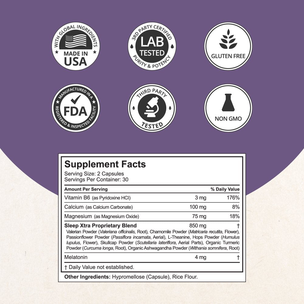 - THE GOODNESS INSIDE: Proudly manufactured in the USA using naturally-sourced ingredients and the latest technological breakthroughs for quality and value. Sleep Xtra capsules are GMO-free, gluten-free, soy-free, dairy-free, nut-free, egg-free, and suitable for vegans and vegetarians.