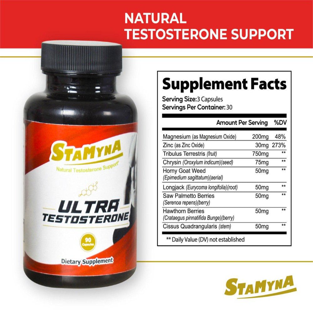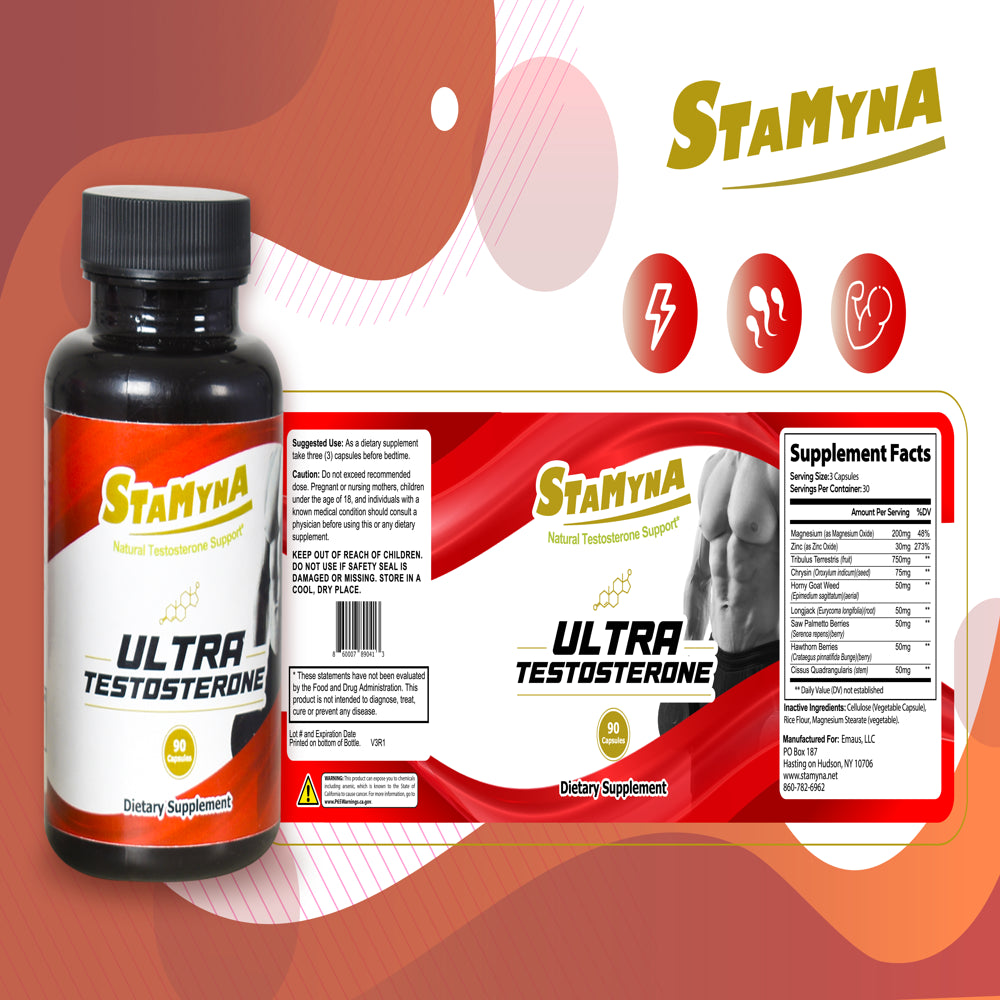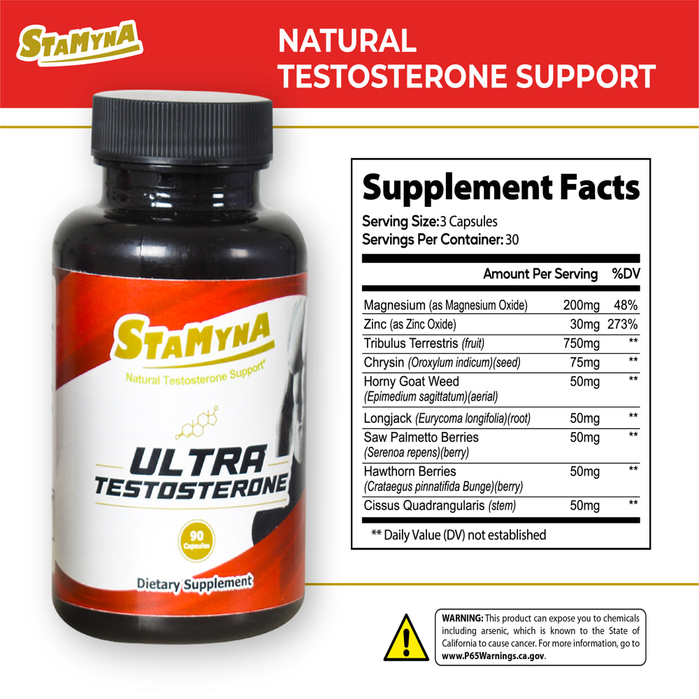 STAMYNA Ultra Natural Testosterone: Unleash Your True Potential! Revitalize Your Vigor and Vitality! Stamyna Ultra Natural Testosterone is a groundbreaking supplement designed to energize your life in multiple ways. Crafted for men who seek to enhance their physical and sexual well-being, this potent formula is your ally in achieving superior health and vitality. Key Benefits & Features: Hormonal Support: Our unique blend aids in balancing and supporting natural testosterone levels, which are essential for male sexual drive, development, and function. Muscle Growth & Strength: Experience a significant boost in muscle gain and strength, laying the foundation for a stronger, more resilient body. Optimized Recovery & Sleep: It's not just about strength; Stamyna Ultra also optimizes your body's recovery process and improves sleep quality, essential for overall well-being. Elevated Energy Levels: Feel a surge of energy throughout the day, powering your workouts and daily activities with increased stamina and endurance. Enhanced Libido: A safe and healthy way to naturally improve male libido, giving you the confidence and drive you need. Weight Management Support: A notable benefit of Stamyna Ultra includes weight management and loss assistance, promoting a healthier physique. Product Information: Serving Size: 3 Capsules Directions: Take three (3) capsules in the morning, preferably before a workout, for optimal results. Capsules Per Container: 90 It contains natural vitamins, minerals, and herbs (Saw Palmetto, Horny Goat Weed, Long Jack, Tribulus Terrestris) to make extremely effective testosterone support. These vitamins and herbs help to support the body’s natural production of testosterone. This product can help boost the body’s testosterone to increase positive bodybuilding, exercise, and libido results.