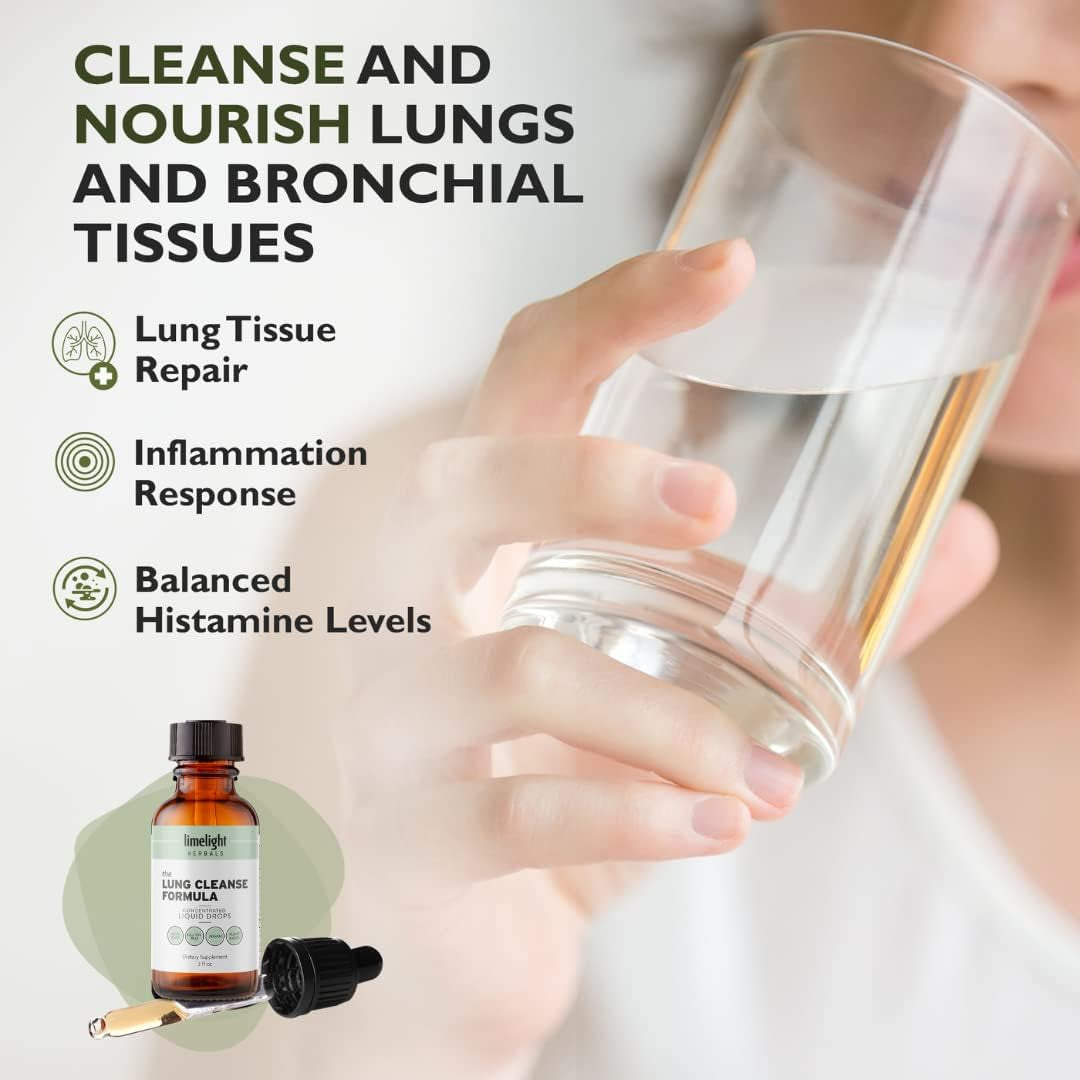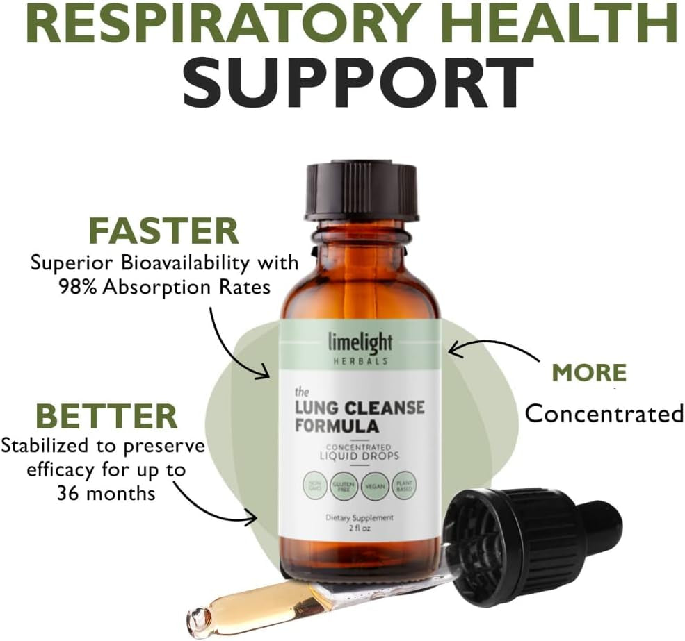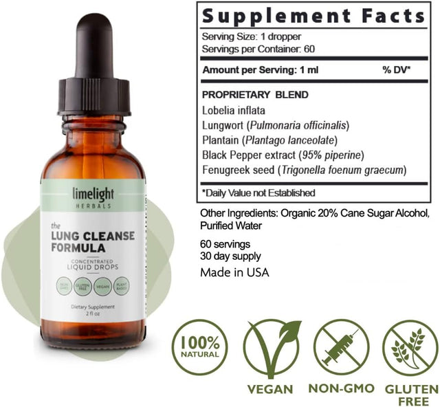 3 Potent Herbal Extracts for Your LungsThis liquid-based, plant-derived formula is designed for easy absorption, allowing your body to quickly and effectively utilize the immune-boosting benefits in every drop. Made with tried and tested ingredients, this formula provides optimum support for your immune system. | Perfected by a Master HerbalistOur Master Herbalist has perfected this tincture by carefully crafting it according to ancient tradition, ensuring that each bottle provides maximum health support. Made with pure raw herbal extracts, this Lung Cleanse Formula is both gentle and powerful. | Made from Safe, All-Natural IngredientsExperience the power of nature with this Vegan, non GMO, and Gluten Free formula, made with safe and all-natural ingredients. Our formula is free of potentially harmful chemicals, and every drop is packed with the most effective herbs for optimal results. Trust in the purity and potency of our all-natural formula for a truly safe and effective solution. |