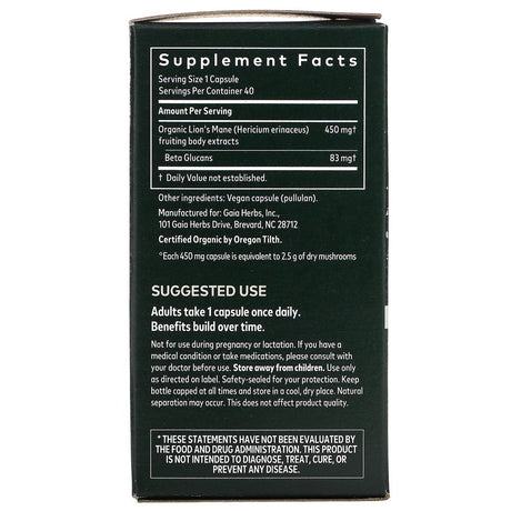 Gaia Herbs, Lion'S Mane Mushroom, 40 Vegan Capsules