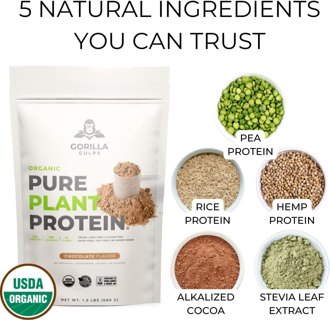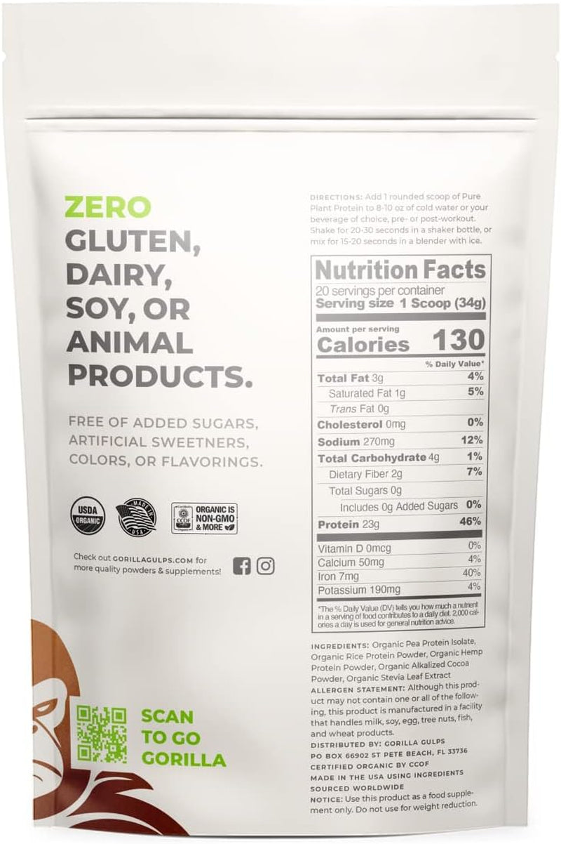 Gorilla Gulps 100% Organic Pure Plant Protein has everything you need to maximize your plant-based gains. Our complete plant-based protein blend is made up of PEA, RICE, & HEMP, providing the essential amino acids and BCAAs needed to build muscle effectively. 130 calories and 23 grams of protein in each serving (1 scoop). CLEAN. LEAN. GAINS. - Use to add quality protein (in its purest form) to your diet pre and post workout.