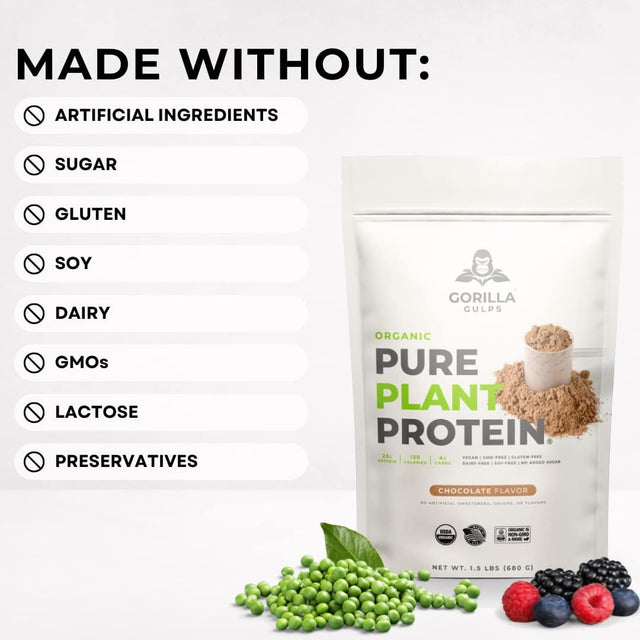 - Clean Minimalistic Formula, Free of Sugar & Fillers: Your body functions best when nourished with products that are free of artificial sweeteners, additives & fillers; Gorilla Gulps Pure Plant Protein powder has no sugar, soy, wheat, dairy, gluten, GMOs, lactose or preservatives.