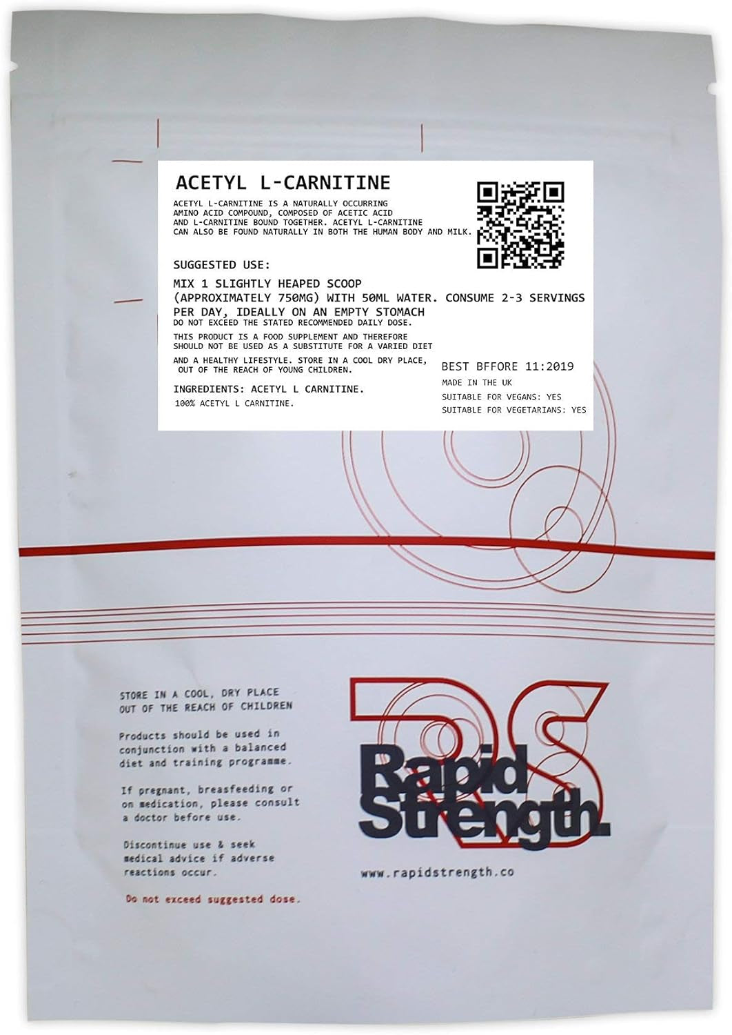 BENEFITS OF ACETYL L-CARNITINE 100% Pure Acetyl L-Carnitine Popular for over a decade Crosses the blood brain barrier Incredible value for money WHO IS ACETYL L-CARNITINE SUITABLE FOR? Acetyl L-Carnitine is ideal for those on a calorie-controlled diet. It would be ideal to combine Acetyl L Carnitine with Green Tea Extract Powder, Green Coffee, Glucomannan, TTA or Caffeine Tablets 200mg. How can acetyl-carnitine help support my diet plan? Acetyl-L-Carnitine is an acetylated form of the naturally occurring amino acid, l-carnitine, which is proven to be more effective than l-carnitine on its own. It is most effective when consuming 750mg of Acetyl-L-Carnitine 2-3 times a day and is available in a free flowing powder to be conveniently taken whenever. What other supplements can I mix this powder with? Due to the solubility of Acetyl-L-Carnitine, it can be mixed with a range of beverages, making it easy to meet the daily recommended dosages. You can mix each 750mg serving with your existing supplements, with water or various other beverages such as, cranberry juice, squash, or lemon/lime water. When is the best time to take Acetyl-L-Carnitine? Unlike many fat loss supplements such as Green Tea Extract, or Complete Thermogenic, Acetyl-L-Carnitine can be consumed at any time throughout the day. For best results, we recommend consuming 2-3 serving across 3 time of the day. Ideally on an empty stomach. Disclaimer: Implied results may vary. Individuals will respond differently. Implied results assume an appropriate nutrition and training plan. Ingredients 100% Pure Acetyl L-Carnitine