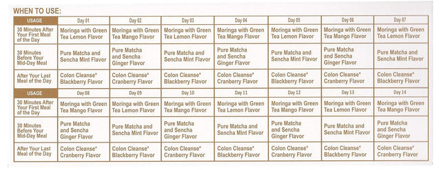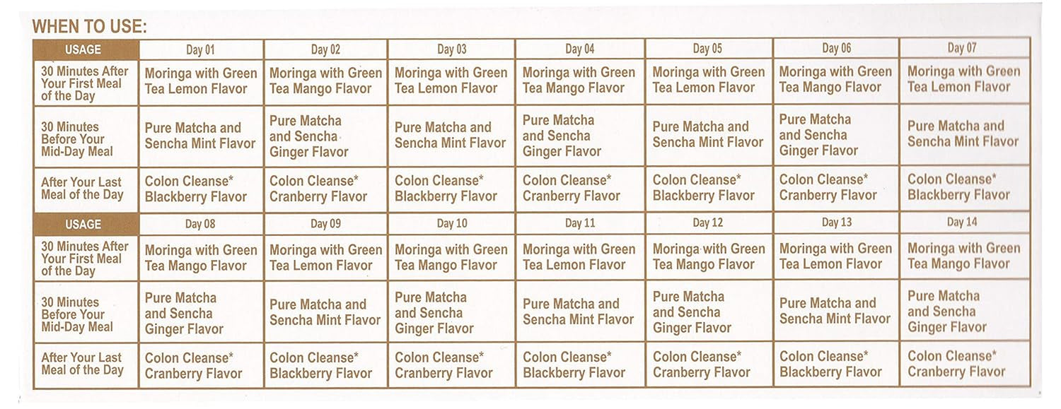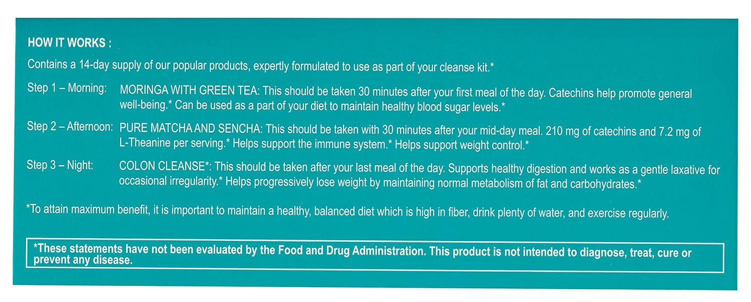HOW TO USE Drink 1 cup as directed in the morning, afternoon and night during the 14-day period. Do not exceed the recommended dosage. Hot Tea – Pour 8 fl.oz. of freshly boiled water in a cup over your tea bag. Cover and steep for 5-8 minutes. Gently squeeze the tea bag to release any remaining extract. Iced Tea – Prepare hot tea with 4 fl.oz. of water. Let it cool and pour into an ice-filled glass. The melting ice will dilute tea to serving strength. These steps directly influence the amount of beneficial components that end up in your cup. Store in a dry place with no odors. *To attain maximum benefit, it is important to maintain a healthy, balanced diet which is high in fiber, drink plenty of water, and exercise regularly. NOTICE FOR MORINGA WITH GREEN TEA AND PURE MATCHA AND SENCHA HERBAL SUPPLEMENTS: Please consult your physician prior to the use if you are pregnant, nursing, taking medication or have a prevalent medical condition. Keep out of the reach of children. NOTICE FOR COLON CLEANSE HERBAL SUPPLEMENTS: This product contains senna leaf. Read and follow directions carefully. DO NOT USE if you have or develop diarrhea, loose stools, or abdominal pain because senna leaf may worsen these conditions and be harmful to your health. Consult your physician if you have frequent diarrhea or if you are pregnant, nursing, taking medication, or have a medical condition. Keep out of the reach of children.