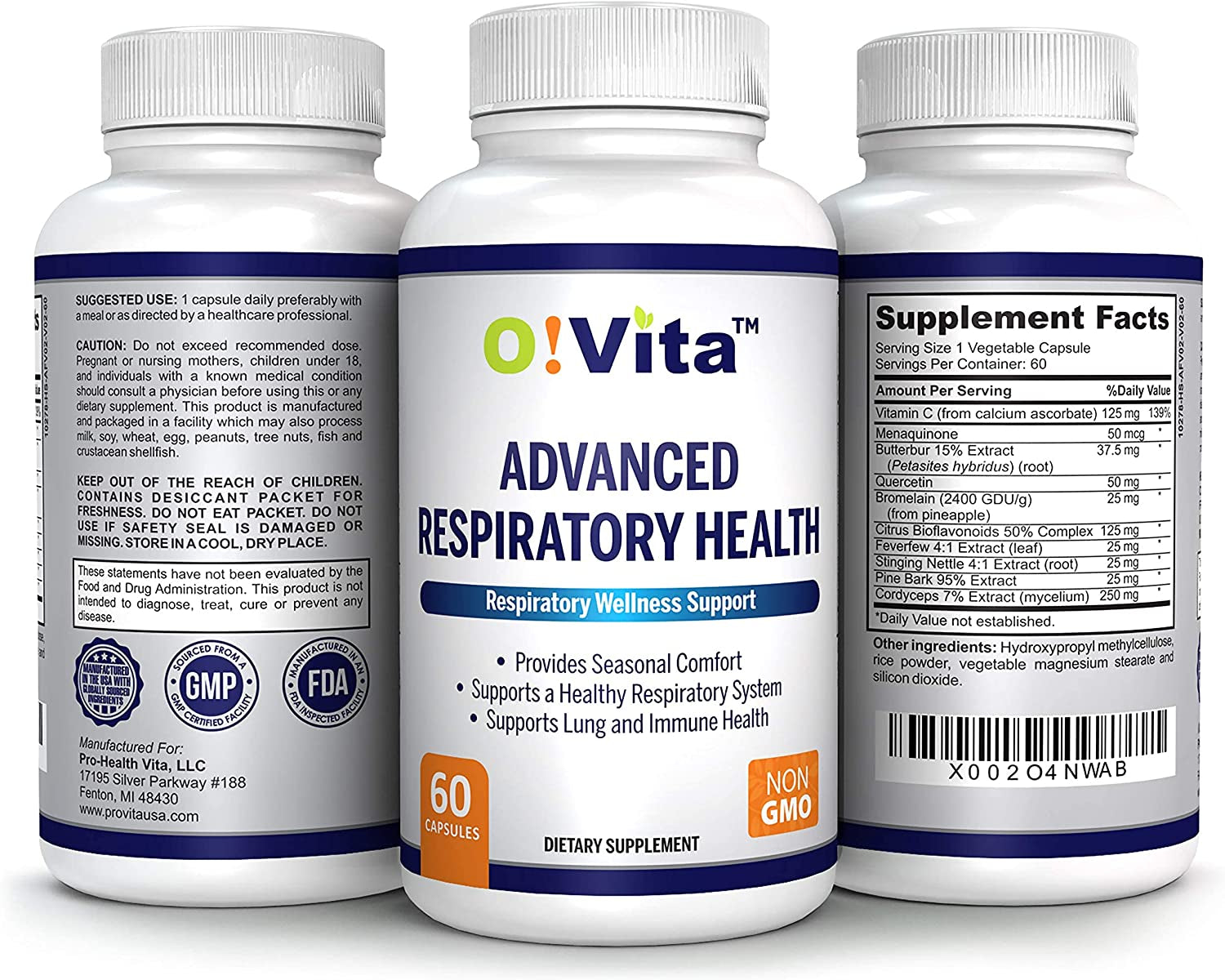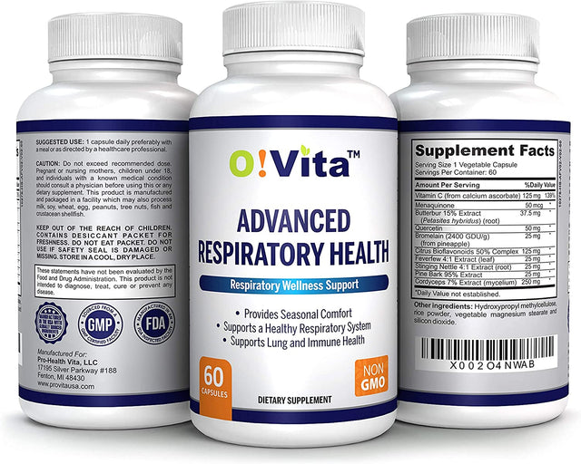 All herbal ingredientsO!VITA respiratory health product uses 10 active herbal ingredients including quercetin, bromelain, butterbur, fever few, and more. | Special formulationThis specially formulated supplement supports allergy relief and supports seasonal respiratory comfort. | Vegan formulaThis supplement is completely vegan - product ingredients are rich in nutrients, grown naturally, clean and healthy. |