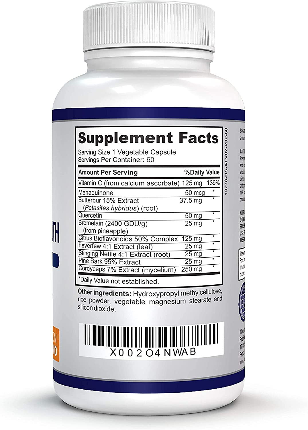 | Special Ingredients | Quercetin, Butterbur, Cordyceps, Feverfew |