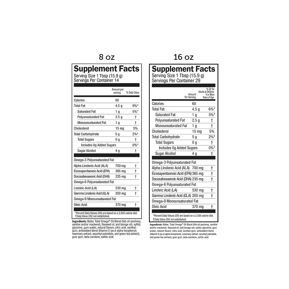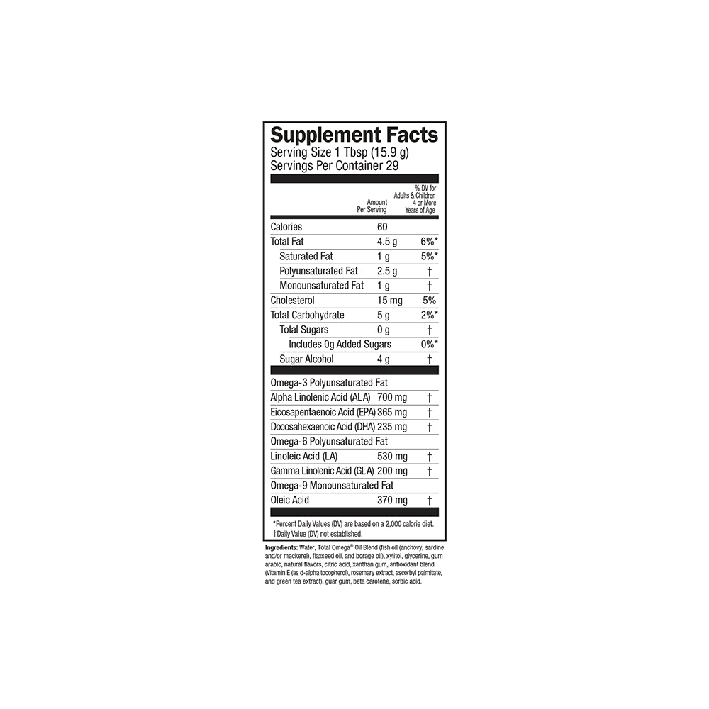 Water, total omega oil blend (fish oil (anchovy, sardine and/or mackerel), flaxseed oil, and borage oil), xylitol, glycerine, gum arabic, natural flavors, citric acid, xanthan gum, antioxidant blend (vitamin E (as d-alpha tocopherol), rosemary extract, ascorbyl palmitate, and green tea extract), guar gum, beta carotene, sorbic/div>