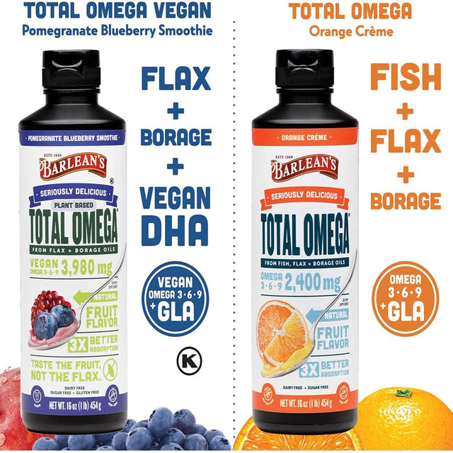 Barlean'S Total Omega Orange Crème Fish Oil Supplements with Flax Seed Oil and Borage Oil - 2,400 Mg of Omega 3, 6 and 9 EPA/DHA - All-Natural Fruit Flavor, Non-Gmo, Gluten-Free - 16 Oz