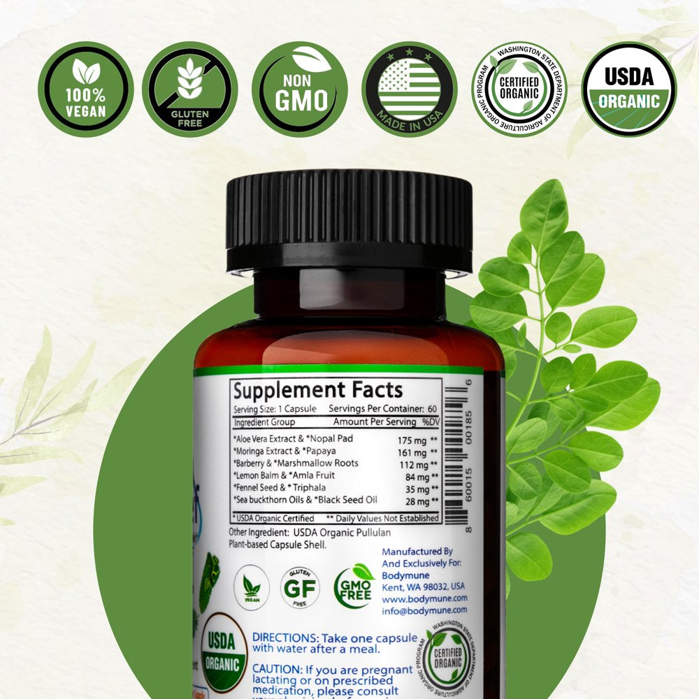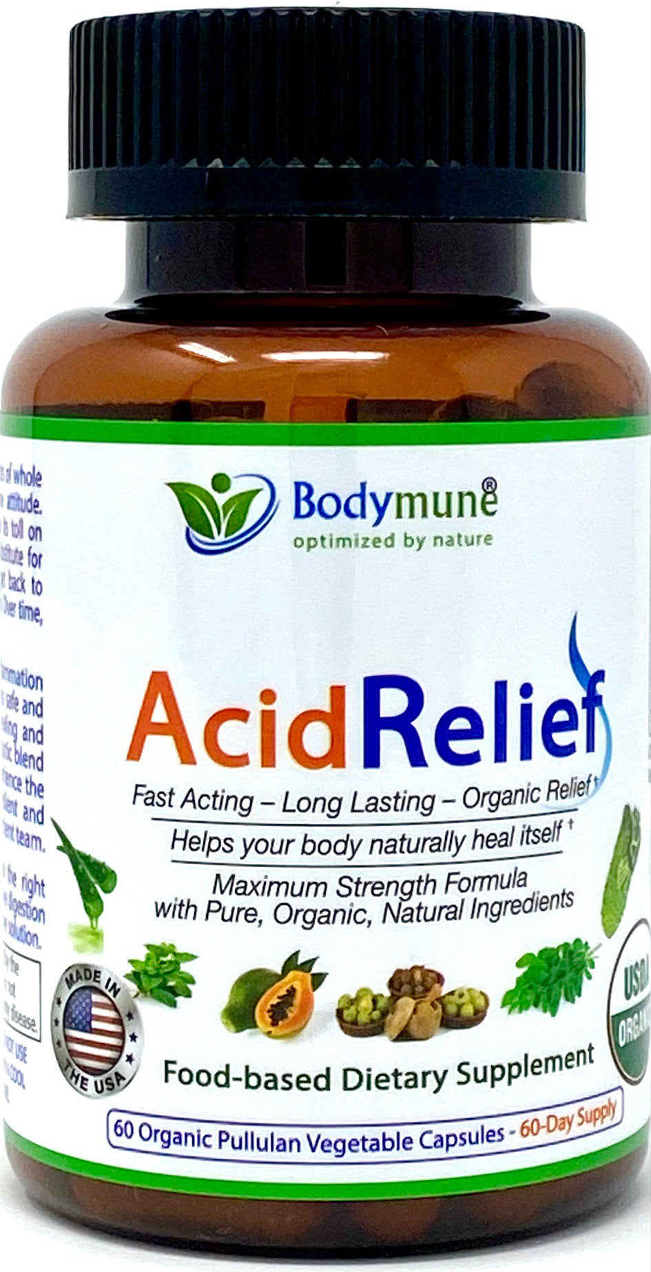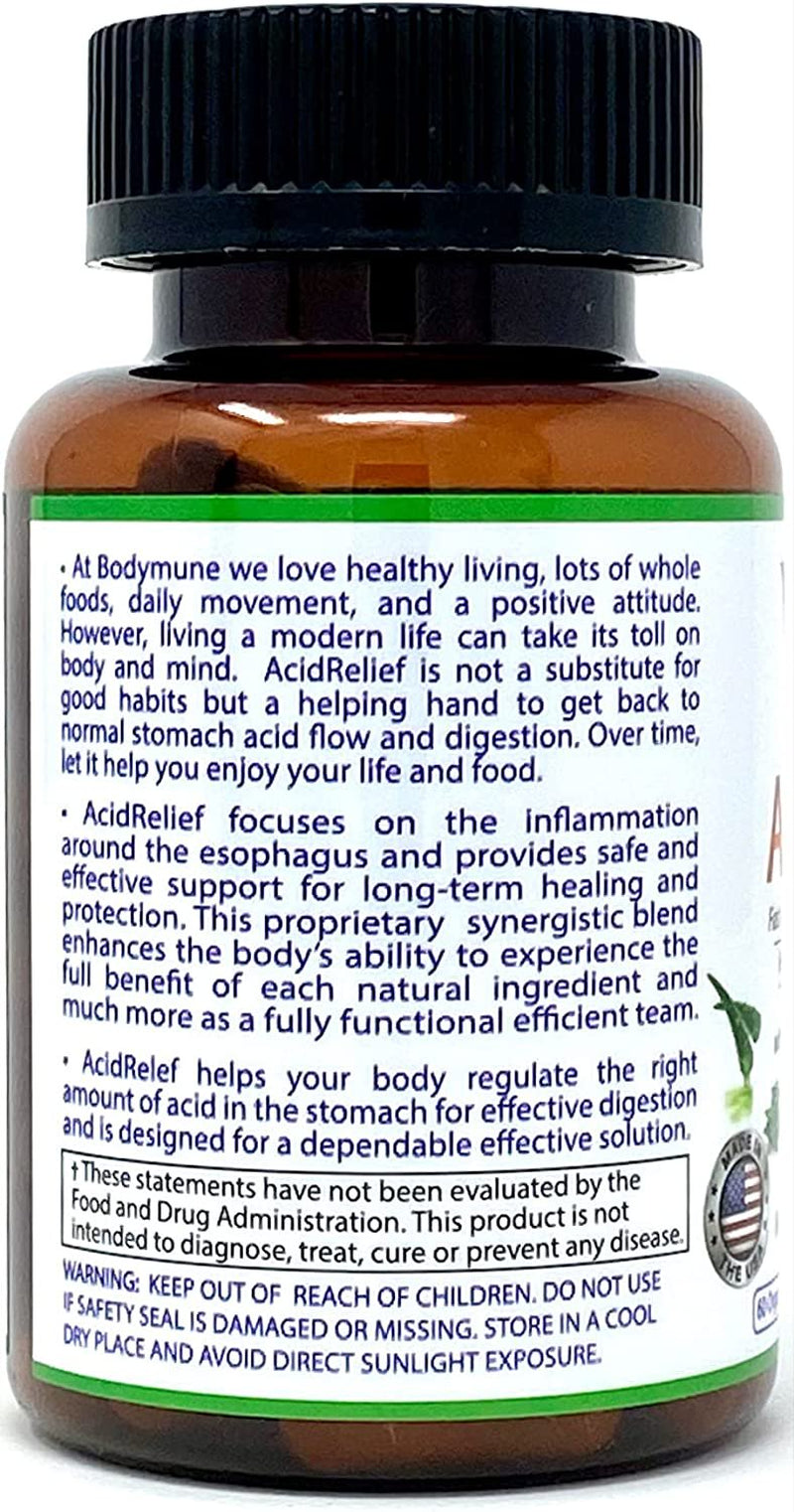 Bodymune Acidrelief All-Natural USDA Organic Acid Relief Supplement, Antacids, Acid Reflux Relief, Heartburn, Acid Indigestion Relief Supplement | 100% Vegan Non-Gmo Gluten-Free USA Made - 60 Capsules