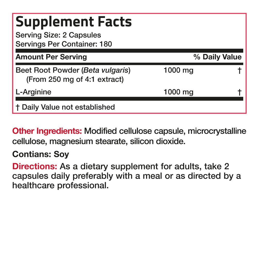 Scientifically formulated with Beet Root and L-Arginine, our premium 2-IN-1 combination supplies 2000 MG per serving to support stamina and NO production.* Laboratory tested Non-GMO and Gluten-Free, Beet Root + L-Arginine is in-house tested and carefully manufactured by trained professionals in our state-of-the-art facility that is located in Hauppauge, New York. Beet Root + L-Arginine is Vegan/Vegetarian friendly and contains no ingredients derived from animals.
