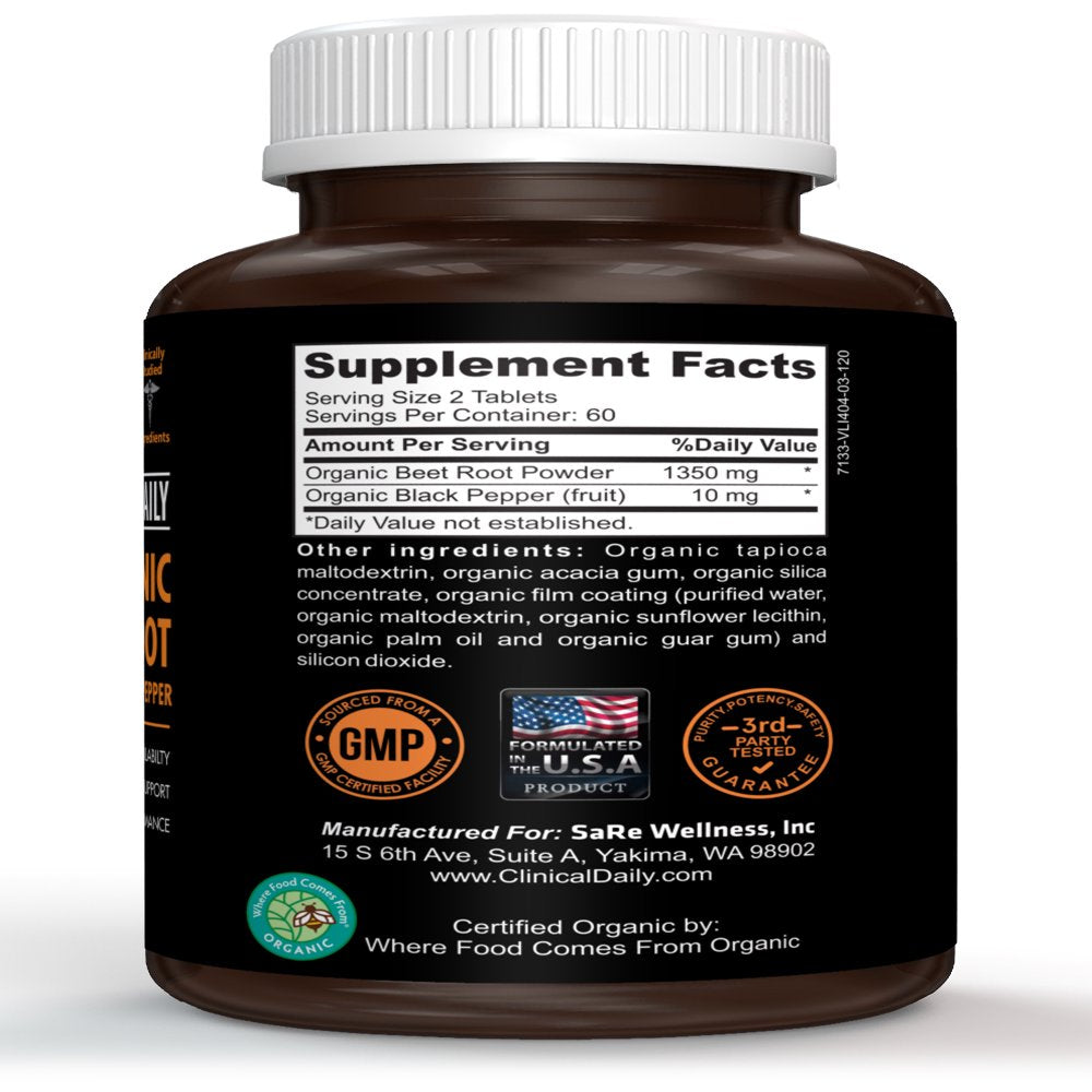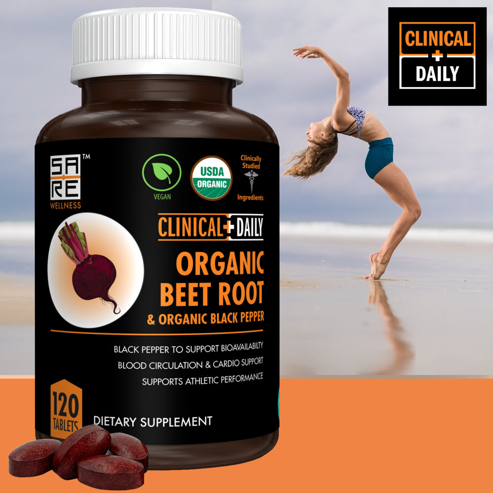 CLINICAL DAILY Organic Beet Root Supplements are non gmo beet root powder in tablet form with 1350mg of Beet Root in each serving. Beet root supplements are available in many forms, beet root capsules, beet root gummies and chews being the most common. We have designed a product with two enhancements to current offerings - 1. Tablets start dissolving immediately instead of delayed dissolution in capsules, or without the added sugar from gummies and chews. 2. Organic Black pepper, or bioperine, causes the bioavailability of beet root to increase at least 30% over what would be absorbed by the body without black pepper or pipra nigra. This is the one complete total beets supplement for your heart health, blood pressure support, circulation and inflammation support - in addition to acting as a nitric oxide supplement boosting available oxygen and nutrients to your organs to support your overall health and wellbeing.