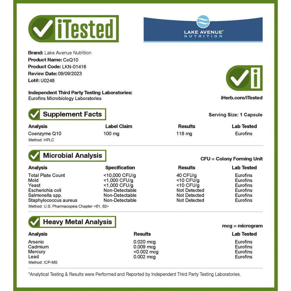 Lake Avenue Nutrition CoQ10 USP Grade Coenzyme Q10 (Ubiquinone) Cardiovascular Support* Antioxidant Properties* Veggie Capsules Formulated without GMOs, Gluten, or Soy Produced in a GMP Facility Lake Avenue Nutrition CoQ10 supplies the body with coenzyme Q10, a necessary substance that can provide cardiovascular support and may enhance blood flow, protect the blood vessels, and promote antioxidant activity.* The Importance of Coenzyme Q10 Coenzyme Q10 is a naturally-occurring substance in the body that aids the mitochondria of cells as they produce energy. Though CoQ10 can be made within our bodies, production tends to decrease with age. Certain conditions or medications can also affect its production, leading to deficiency and health concerns. In some cases, CoQ10 intake through supplements or food may help you get the proper amount to support your health.* Lake Avenue Nutrition CoQ10 contains USP grade coenzyme Q10 in the form of ubiquinone. When taken as directed, this provides a one-year supply iTested Verified
