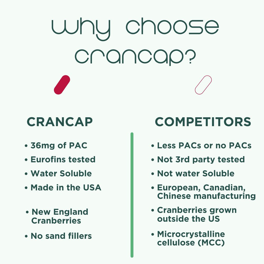 - CranCap takes the power of the superfood cranberry and concentrates it into a powerful little supplement. It's packed with 36mg of proanthocyanidins (PACs), a compound well known for helping to counteract most of what makes you uncomfortable in your lower urinary tract.