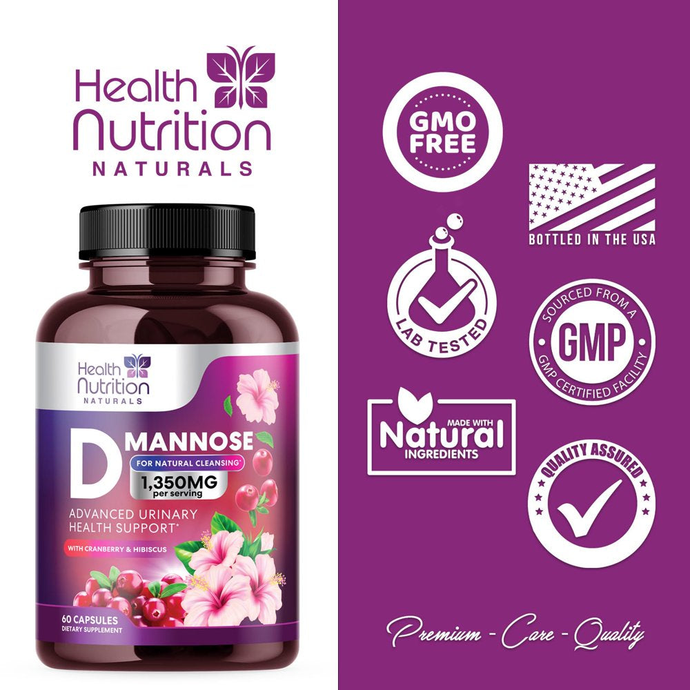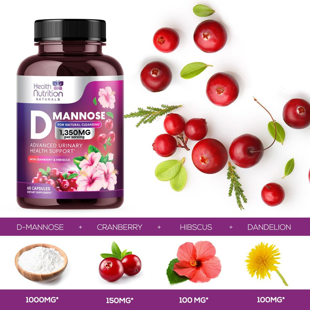 D-Mannose & Cranberry Extract 1350Mg, Fast-Acting to Support Natural Urinary Tract Health for Women & Men, Non-Gmo & Vegan, Flush Impurities in Urinary Tract & Bladder - 60 Capsules