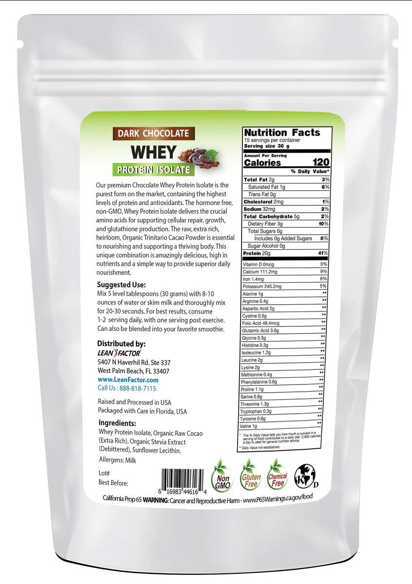Dark chocolate whey protein isolate powder is a perfect blend of 4 high-quality ingredients. Whey protein isolate that is hormone-free and non-GMO. Organic cacao for a delicious dark chocolate flavor. Organic stevia extract to add a lightly sweet taste and a tiny bit of non-GMO sunflower lecithin to ensure it mixes easily.