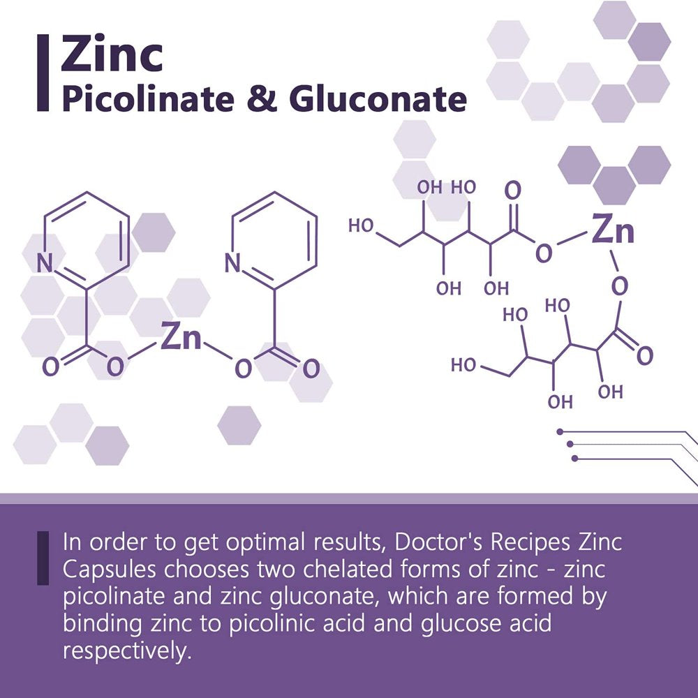 High Dosage Each serving features 50 mg of elemental zinc which represents 455% of the recommended daily value to restore your zinc levels. The vegetable capsule makes it perfect for vegetarian minded users.Chelated Zinc In order to maximize desired results, Doctor?s Recipes Zinc Capsules uses two chelated forms of zinc. Zinc picolinate is a zinc salt of picolinic acid, easily dissolved to release the elemental zinc for use in the body. Zinc gluconate is a zinc salt of gluconic acid comprised of two gluconic acid molecules for each zinc cation (2+), which is also easily absorbed by the body.Natural Immune Defense* Zinc affects multiple aspects of the immune system.* It helps maintain the structural integrity of skin, part of the first line of defense against infection.* Plus, it helps promote the development and function of cells that mediate innate and adaptive immunity, such as neutrophils, natural killer cells, and T cells.*Doctor?s Recipes Zinc 50 mg may help ? Strengthen the Immune Function* ? Make DNA & Protein* ? Support Cell Division & Function* ? Aid Wound Healing*? Bolster Taste, Smell & Vision Health*Pure and Natural Each bottle is 100% natural and pure without any sugar, starch, artificial colors, fillers, flavors, sweeteners, or preservatives. It?s also free of soy, gluten, dairy, egg, wheat, fish, shellfish, tree nuts, peanuts and corn.3rd Party Lab Tested Tested and Approved Independently by 3rd Party Lab in the USAMade in the USA Proudly Made in a cGMP Certified Facility in the USA