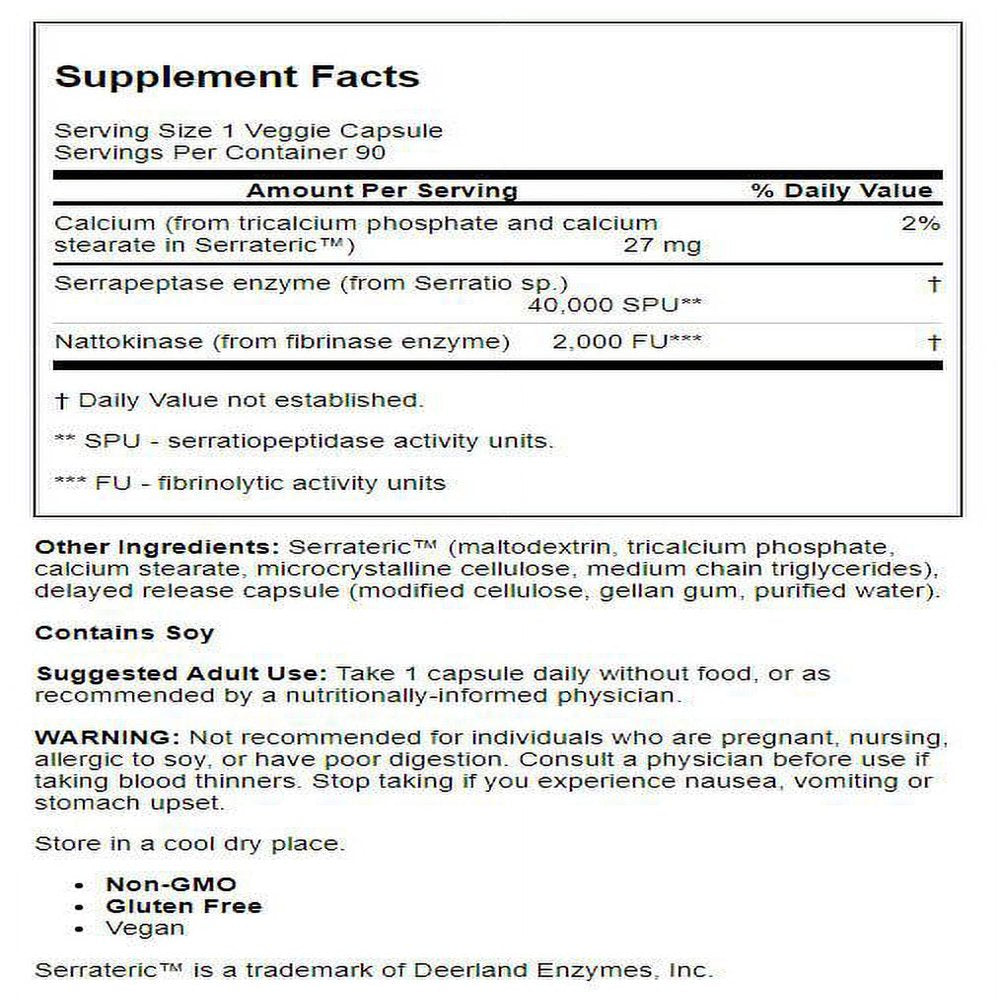 Natto-Serra is a combination of two natural enzymes that have been used as dietary supplements for decades. Serrapeptase (serratiopeptidase) is a protein-digesting enzyme isolated from the friendly bacterium Serratia E-15 discovered in the Japanese silkworm. Nattokinase also digests protein and is derived from "natto", a fermented soy food popular in Japan for centuries. This nattokinase is free of vitamin K . The serrapeptase is formulated with SerratericTM, a superior alternative to enteric coating that protects the enzyme until it reaches the intestines for optimal absorption.
