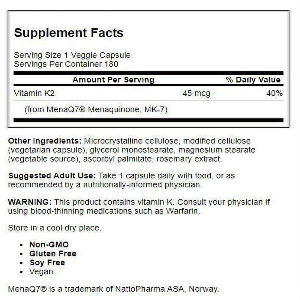 - Doctor's Best Natural Vitamin K2 MK-7 with MenaQ7 45mcg Veggie Capsules, 180 Count