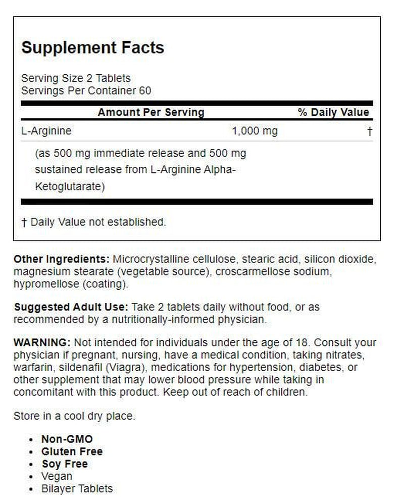 Doctor'S Best Sustained plus Immediate Release L-Arginine, Non-Gmo, Vegan, Gluten Free, Soy Free, 500 Mg, 120 Bilayer Tablets
