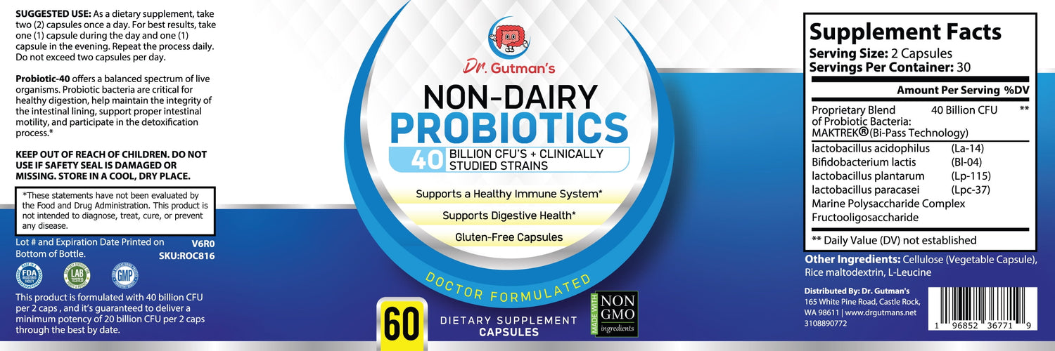 Promote digestive health and support healthy immunity with Dr. Gutman's Non-Dairy Probiotics for men and women (unisex). Our all-natural, gluten-free, non-GMO formula contains a blend of non-dairy probiotics, including lactobacillus acidophilus, bifidobacterium lactis, lactobacillus plantarum, and lactobacillus paracasei, to support a healthy gut and a strong immune system. Our doctor-formulated probiotics are vegetarian and vegan-friendly and contain 40 billion CFUs to enhance gut microbiome, increased muscle mass, support a healthy immune system, reduced cortisol levels, cognitive function, and improved allergy symptoms. Studies show that probiotics can also improve intestinal health, ameliorate symptoms of lactose intolerance, and reduce the risk of other complications due to the support of the immune system. Our non-dairy probiotic is easy to take, and there's no need for refrigeration, making it convenient for home, office, or travel. Each bottle contains 60 vegetarian capsules. Our supplement is made in the USA in a cGMP certified facility, ensuring the highest quality standards. Choose Dr. Gutman's Non-Dairy Probiotic for a healthier gut and overall wellness. Our all-natural probiotics support a healthy immune system, digestive and immune health, enhanced mucosal immune response, and upregulation of genetic markers associated with gut-immune cell activity. Our non-GMO, corn-free, lactose-free, and gluten-free formula is manufactured in an FDA-registered and NSF-certified facility. Dr. Gutman's Non-Dairy Probiotic is an excellent choice for anyone looking to improve their digestive health and overall wellness. Our all-natural, doctor-formulated formula contains a blend of non-dairy probiotics to support a healthy gut and healthy immune system. With no need for refrigeration, our convenient, easy-to-take supplement is perfect for home, office, or travel. Try Dr. Gutman's Non-Dairy Probiotic today. *These statements have not been evaluated by the Food and Drug Administration. This product is not intended to diagnose, treat, cure, or prevent any disease.