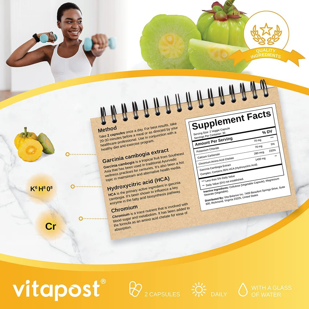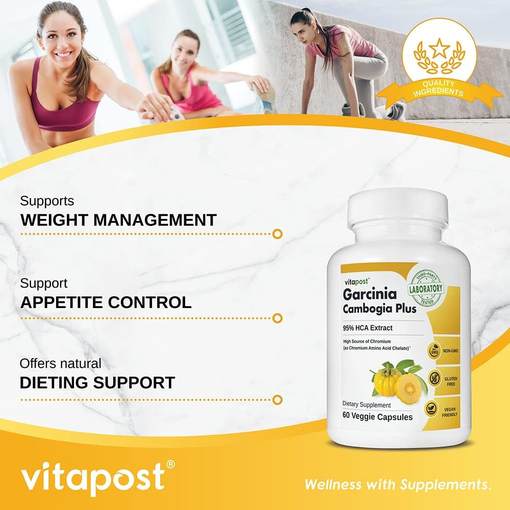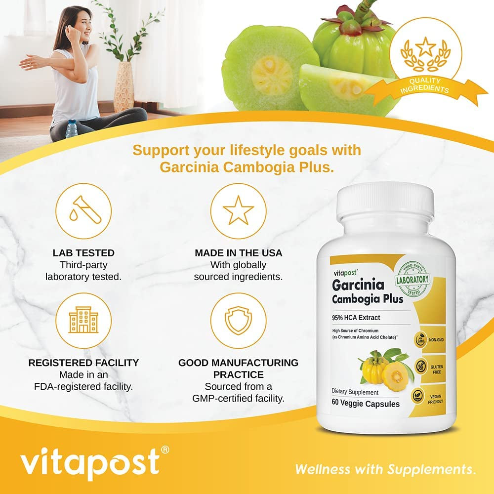 Natural Garcinia CambogiaVitaPost Garcinia Cambogia Plus contains 1400mg of pure garcinia cambogia extract per serving, with a potent concentration of 95% HCA, so you can make the most of its health benefits. | Easy to SwallowNot only is garcinia cambogia known to have a sharp taste, but it is also hard to come by in many countries. VitaPost makes it easy to add this tropical fruit to your diet with easy-to-swallow capsules. | Support your lifestyle goalsGarcinia Cambogia Plus can support you in reaching your lifestyle goals. The vegan-friendly supplement also provides essential trace minerals calcium, potassium and chromium. |