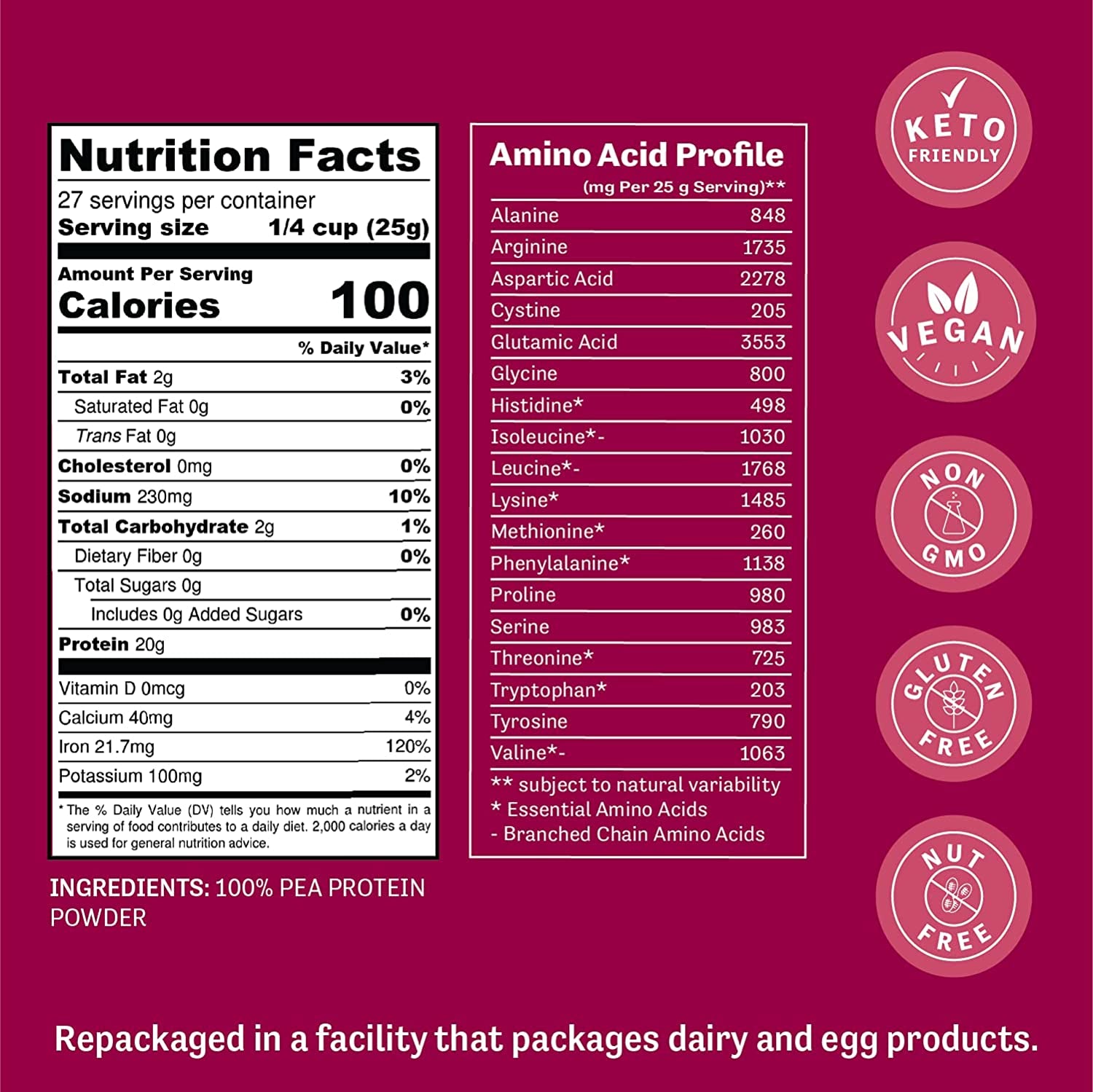 - Ingredients: 100% Pea Protein Powder. Disclaimer: Peas are a legume and may induce symptoms of food allergy in sensitized individuals. Do not consume if you have a legume allergy.
