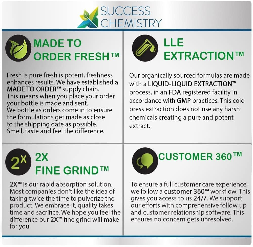 Made in the great USA. Our organically sourced extracts come from the purest of ingredients selected from the clinical trials show to create optimal results. We are 3rd party tested, this assures no heavy metals, pesticides, toxins, preservatives or artificial ingredients are detected. All success chemistry supplements are made in our GMP & FDA-compliant facility.